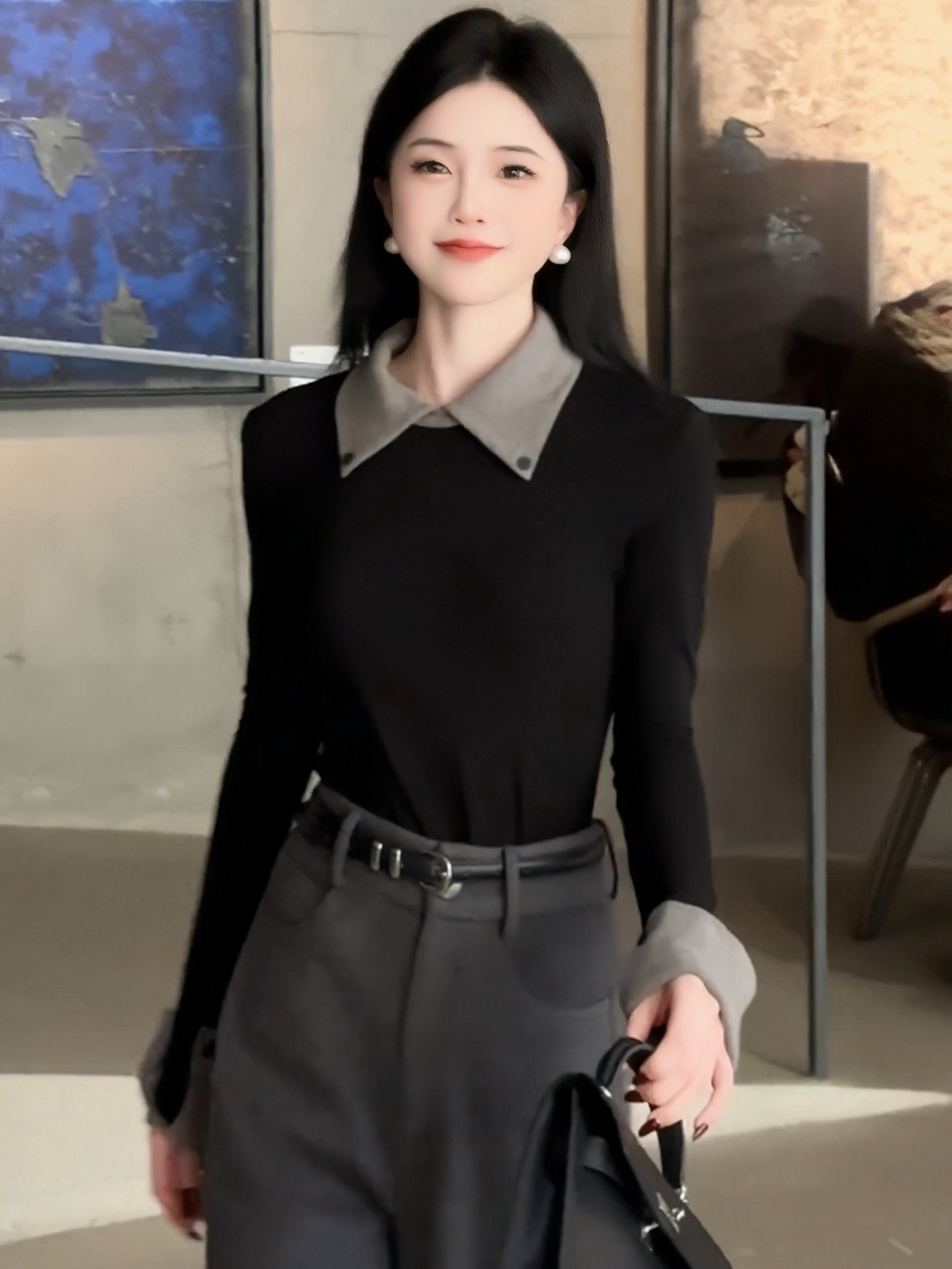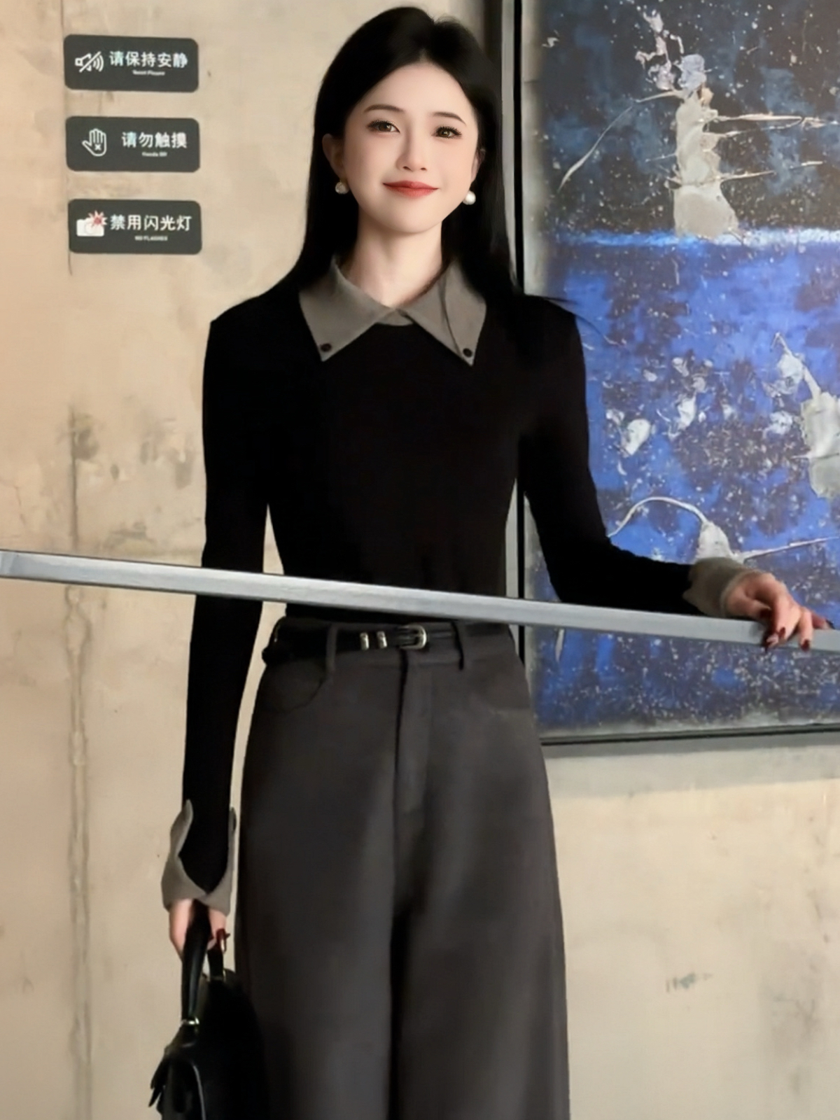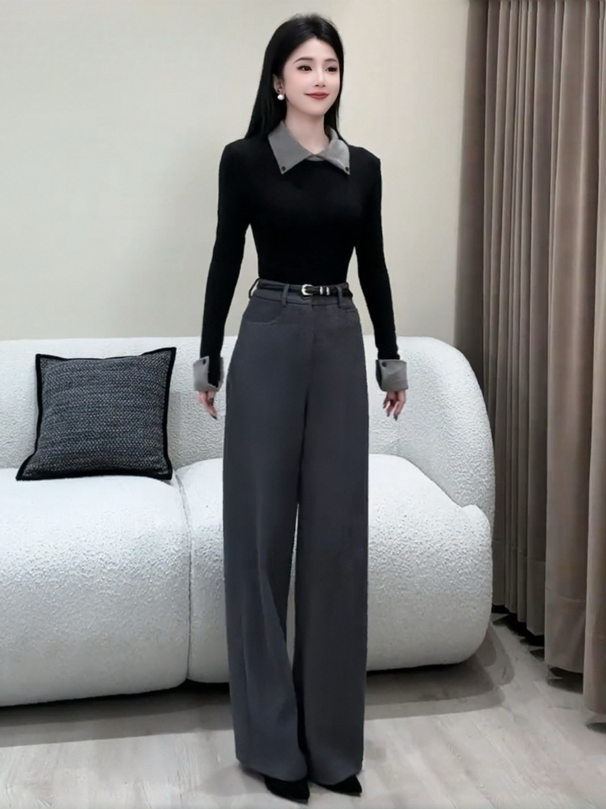 He is good-looking in autumn and winter, a complete set of Korean high-end royal sister temperament, plus fleece long-sleeved T-shirt and wide-leg pants