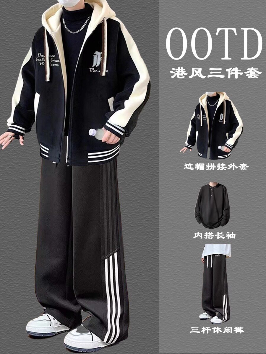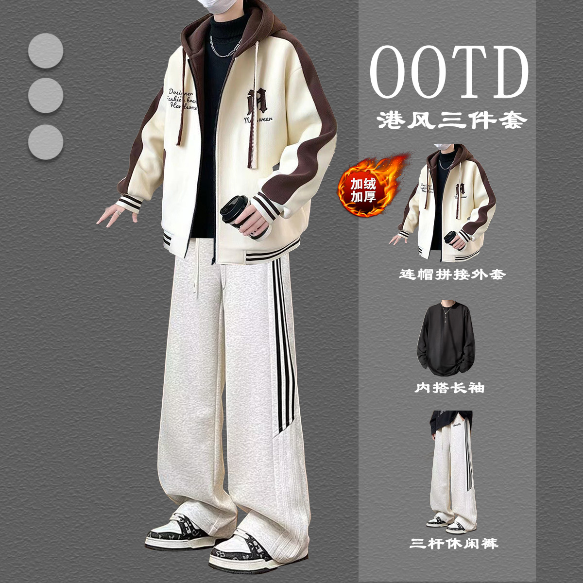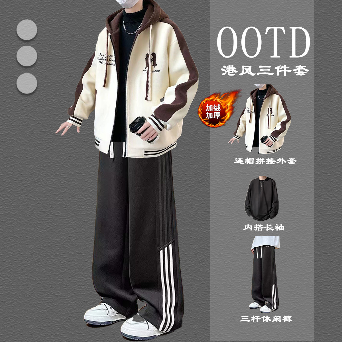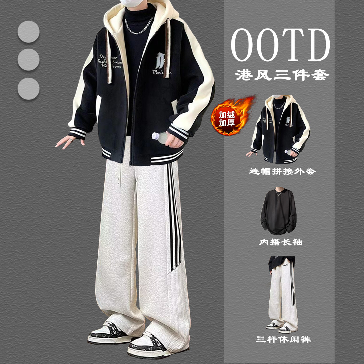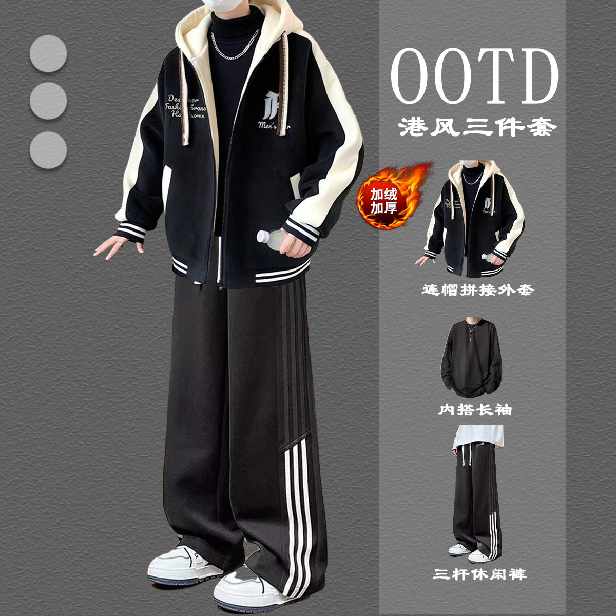 Men's fleece hooded baseball uniform set warm casual sports trousers outfit three-piece set for middle and high school students