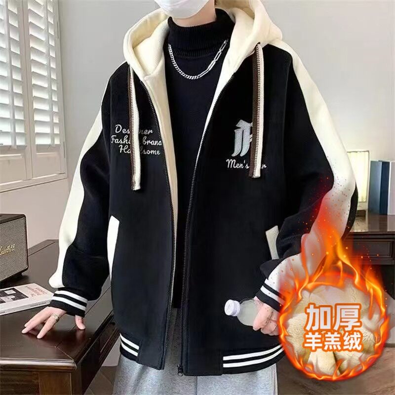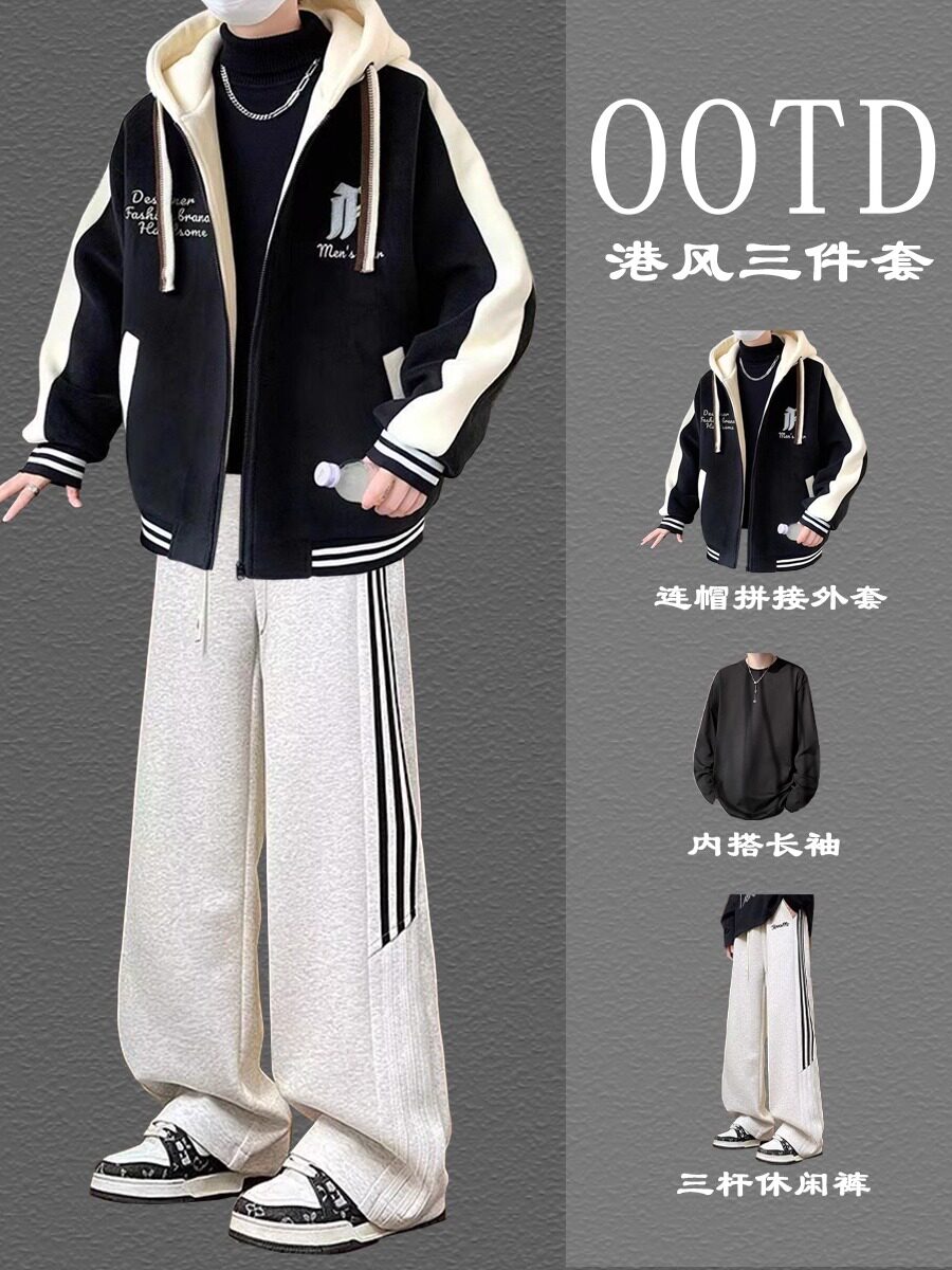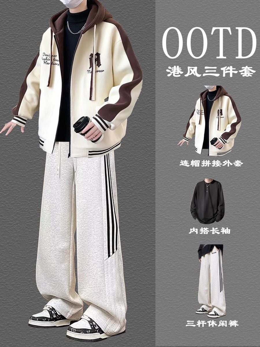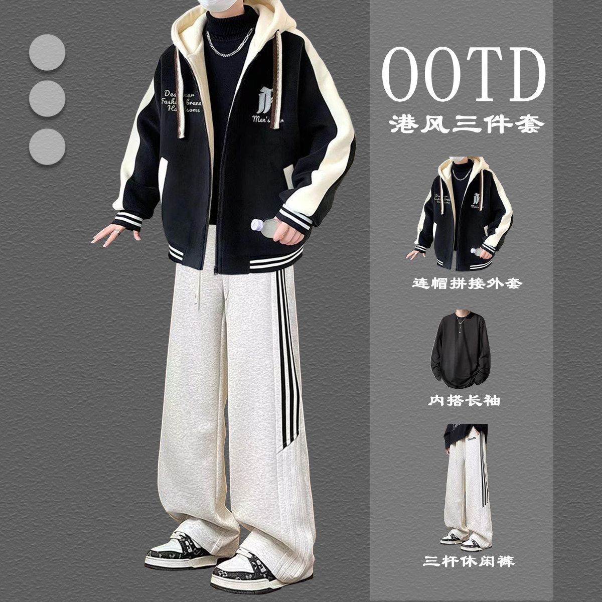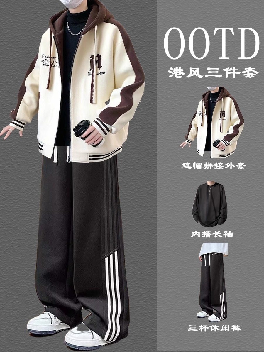 Men's fleece hooded baseball uniform set warm casual sports trousers outfit three-piece set for middle and high school students