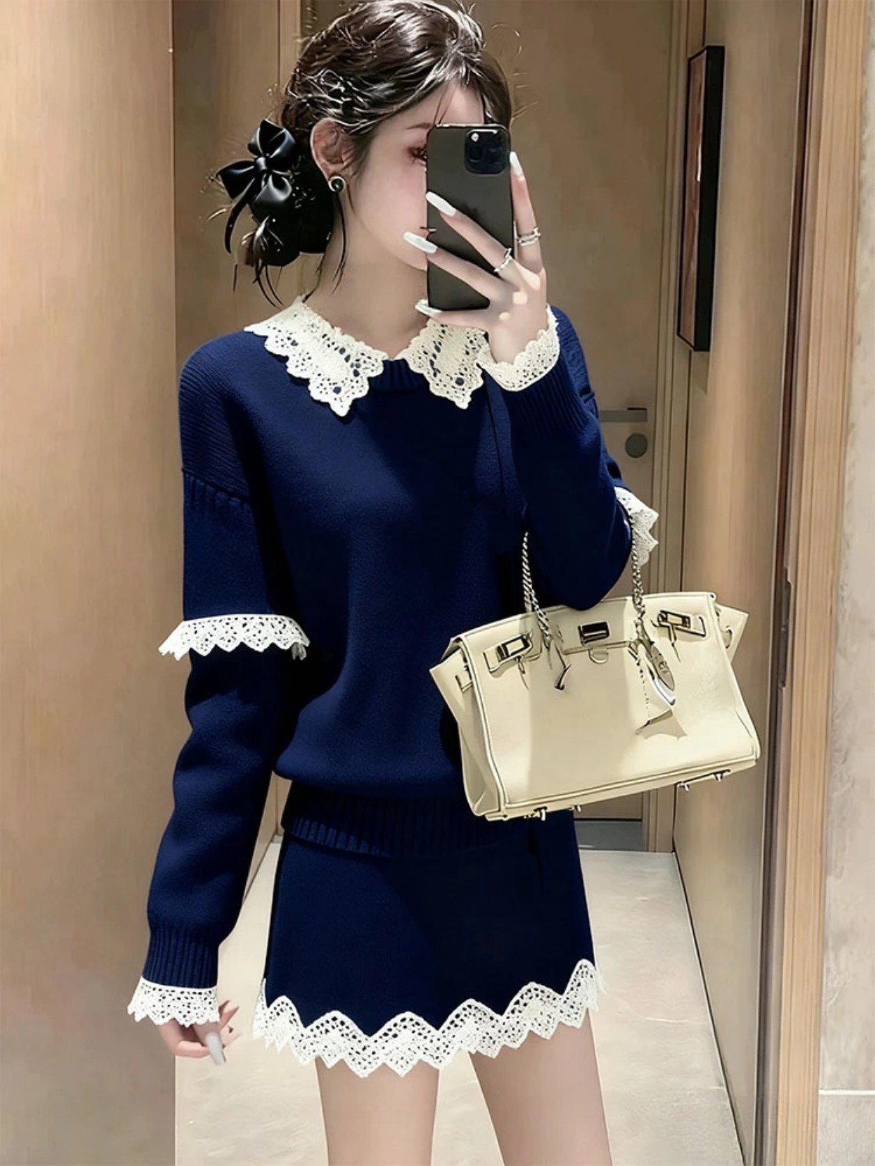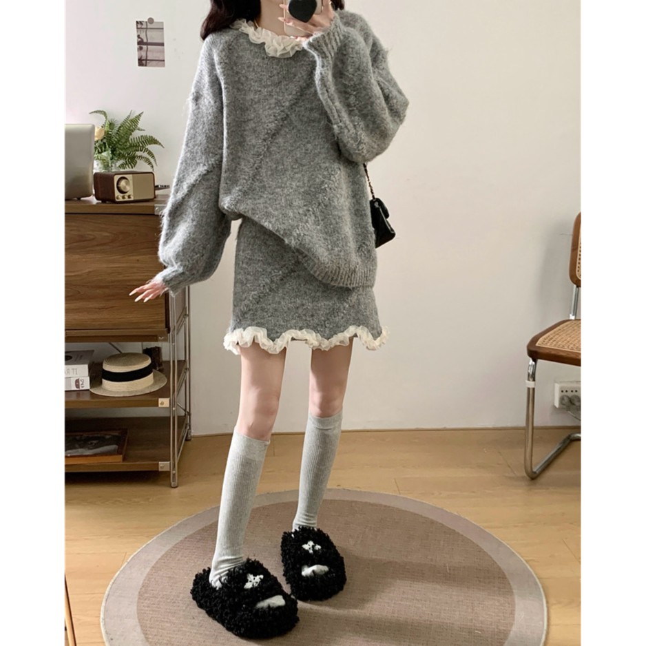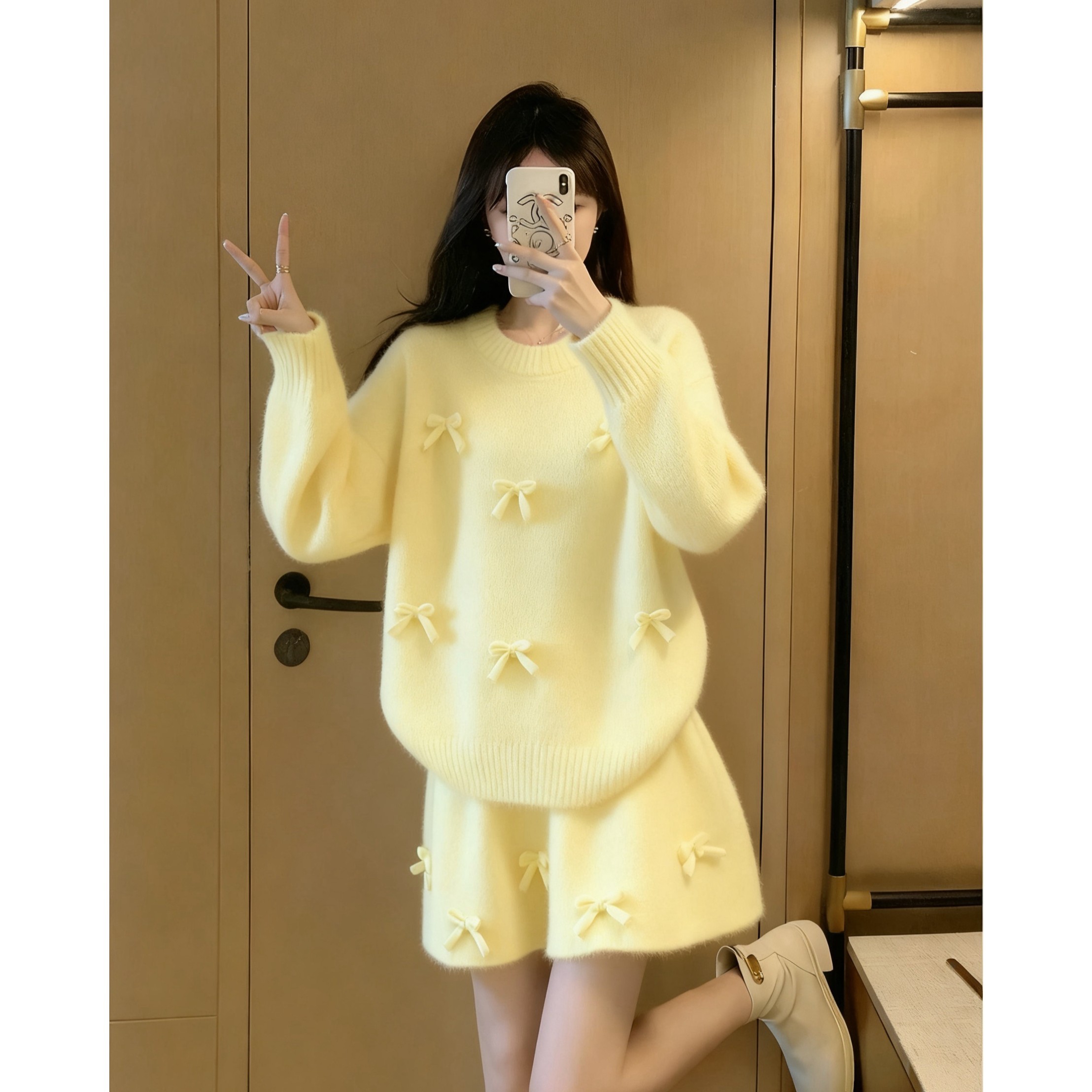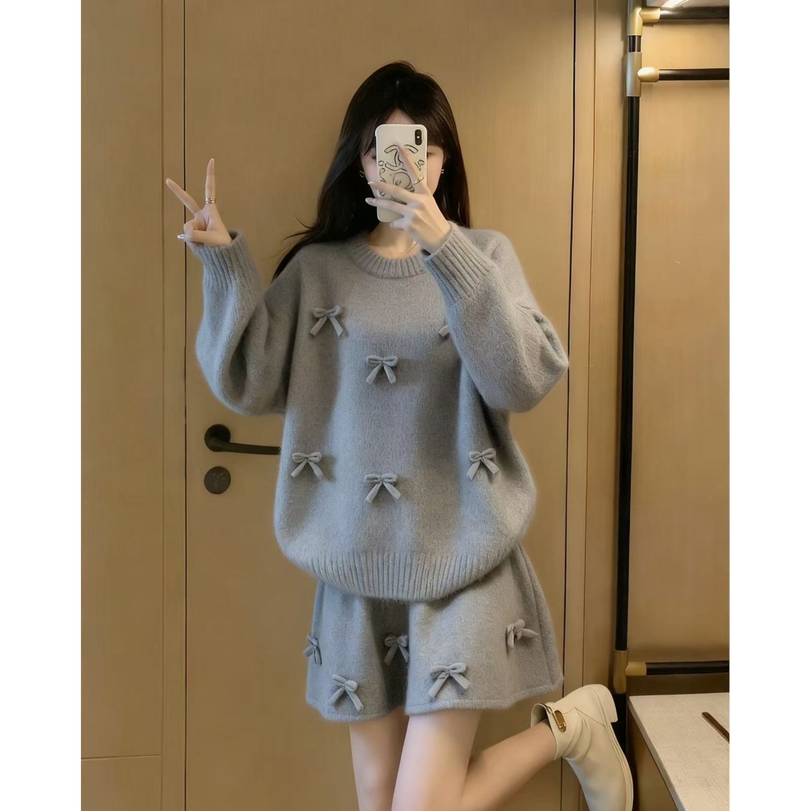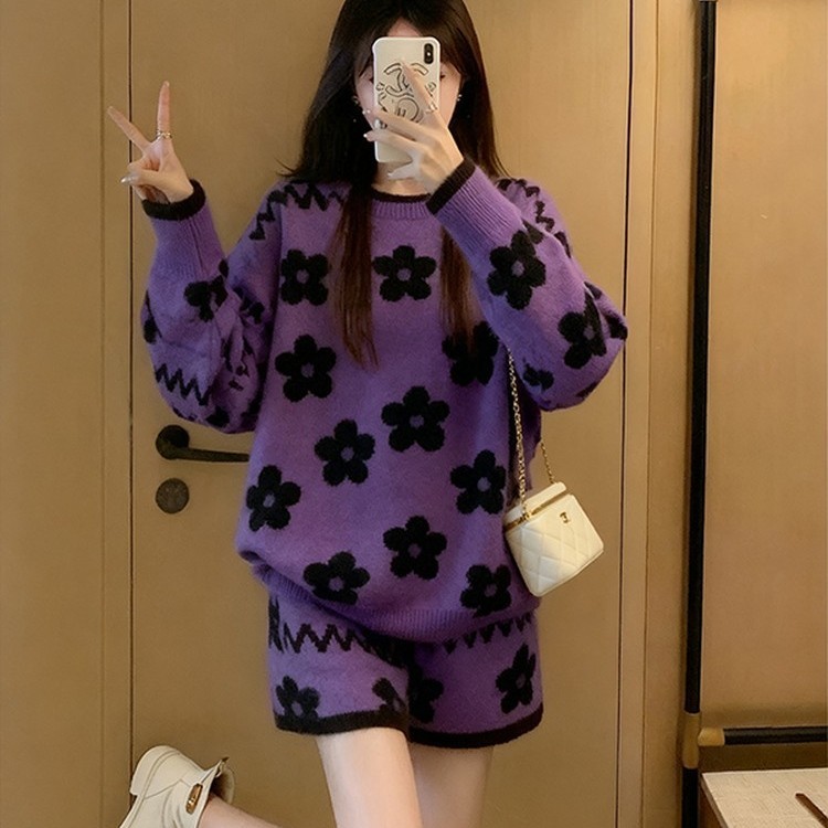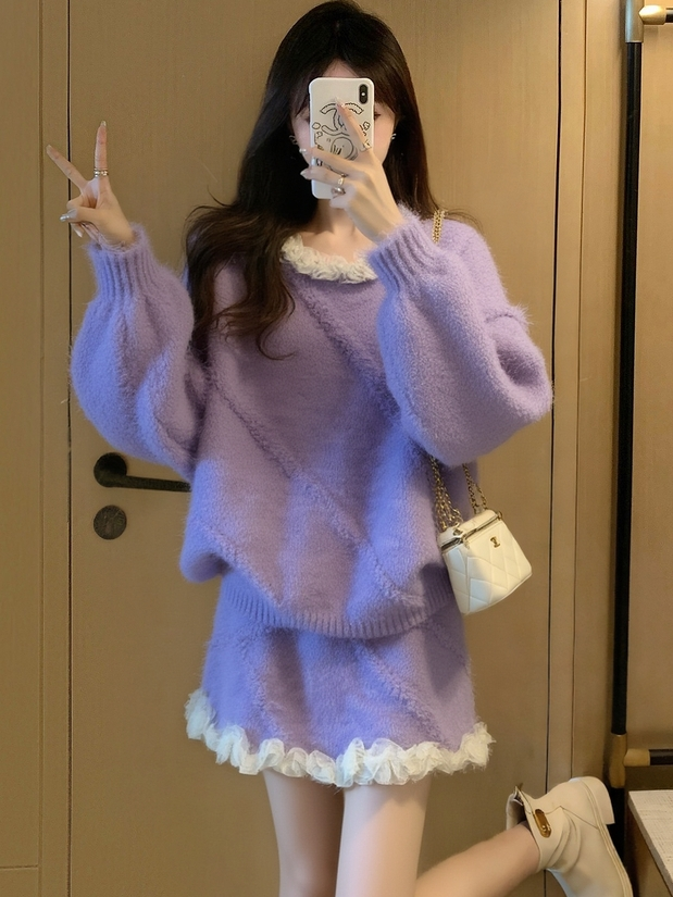 French purple knitted suit women's 2025 new autumn and winter lazy style outfit with a complete set of sweaters and short skirts, two-piece set