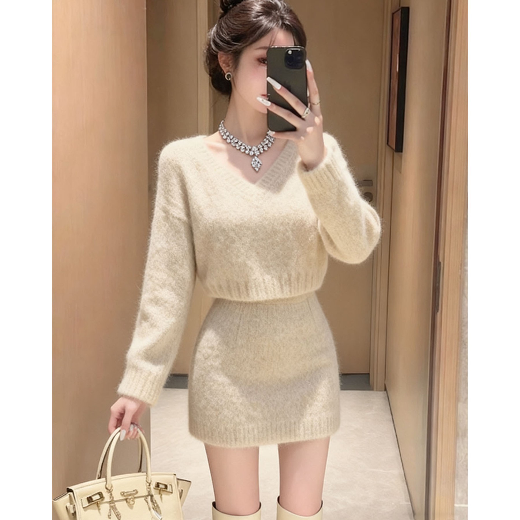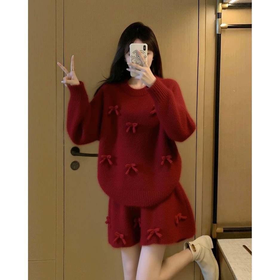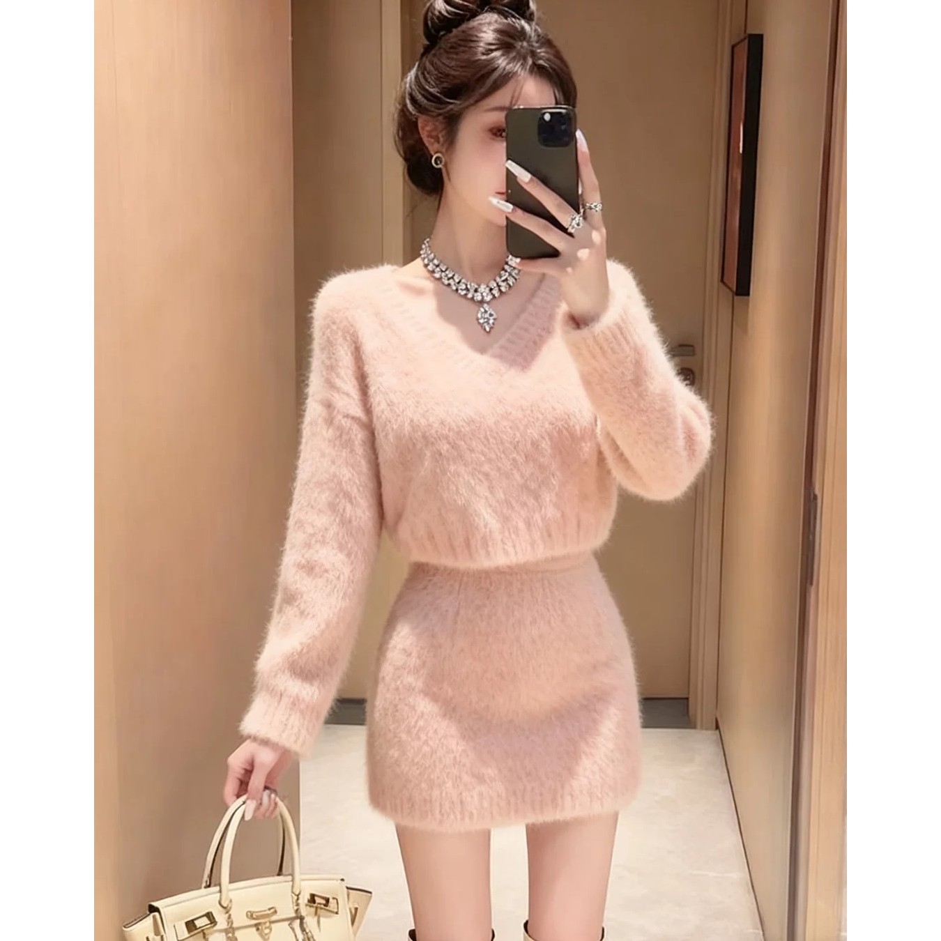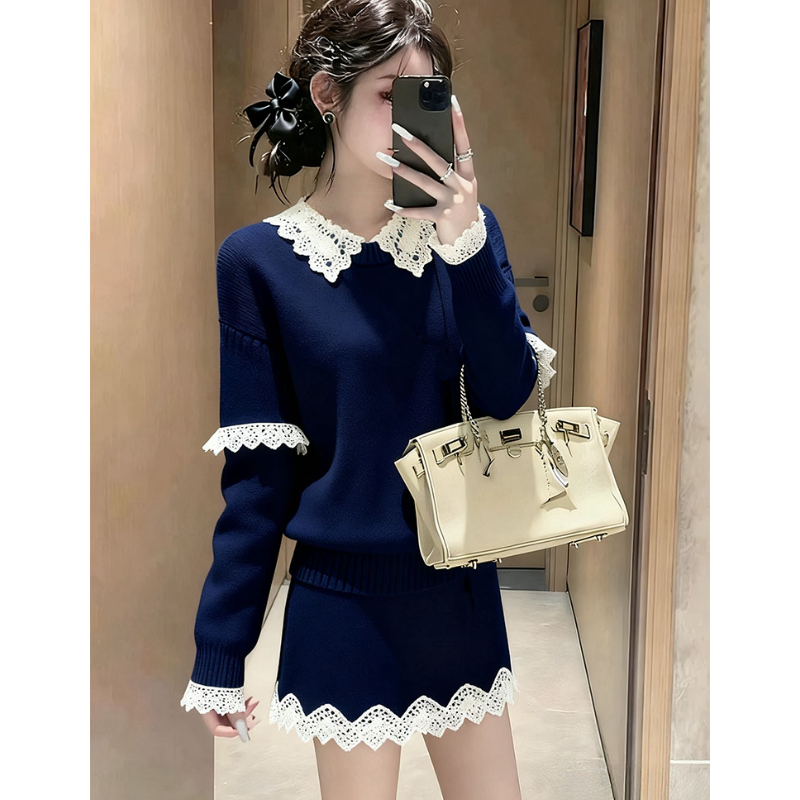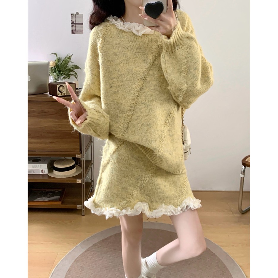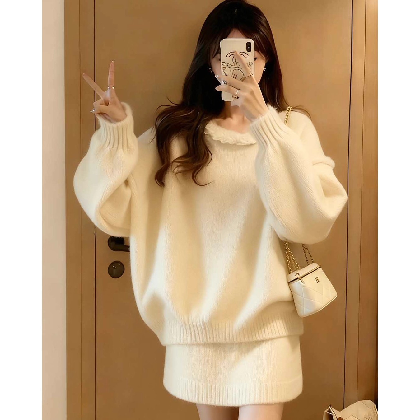 French purple knitted suit women's 2025 new autumn and winter lazy style outfit with a complete set of sweaters and short skirts, two-piece set