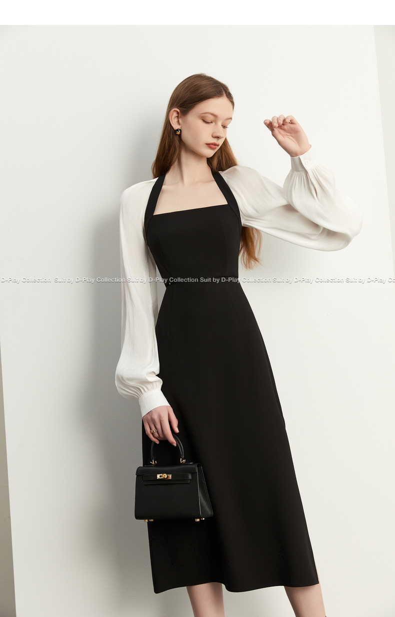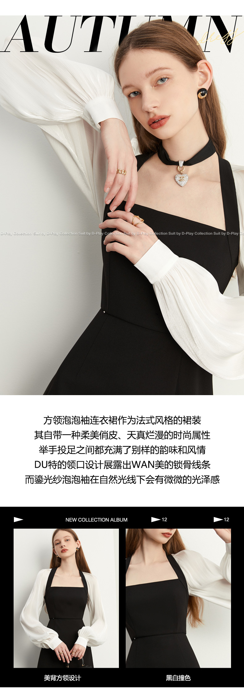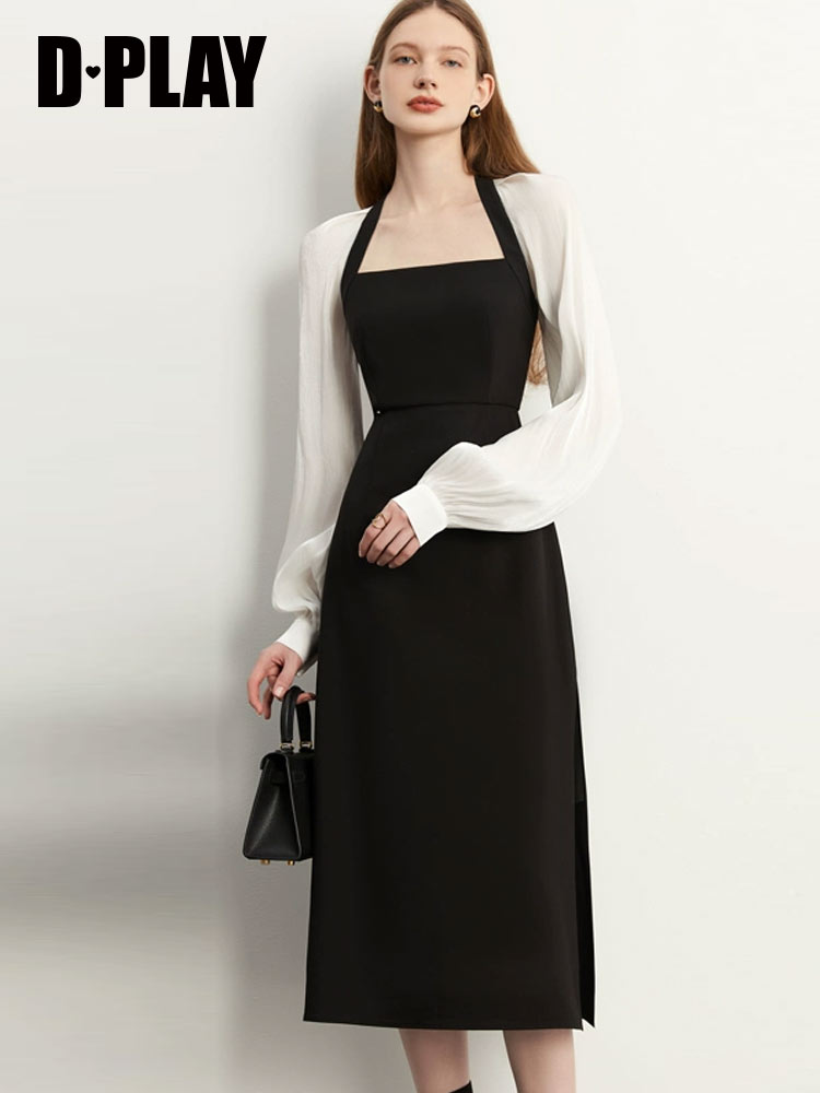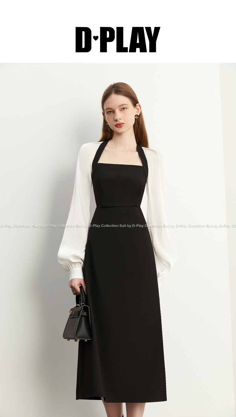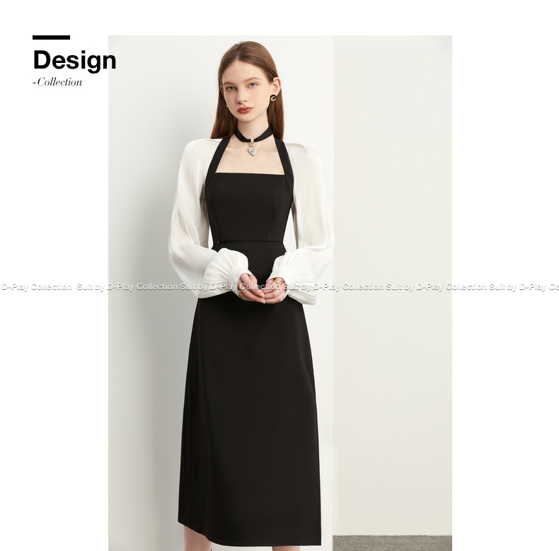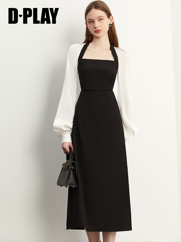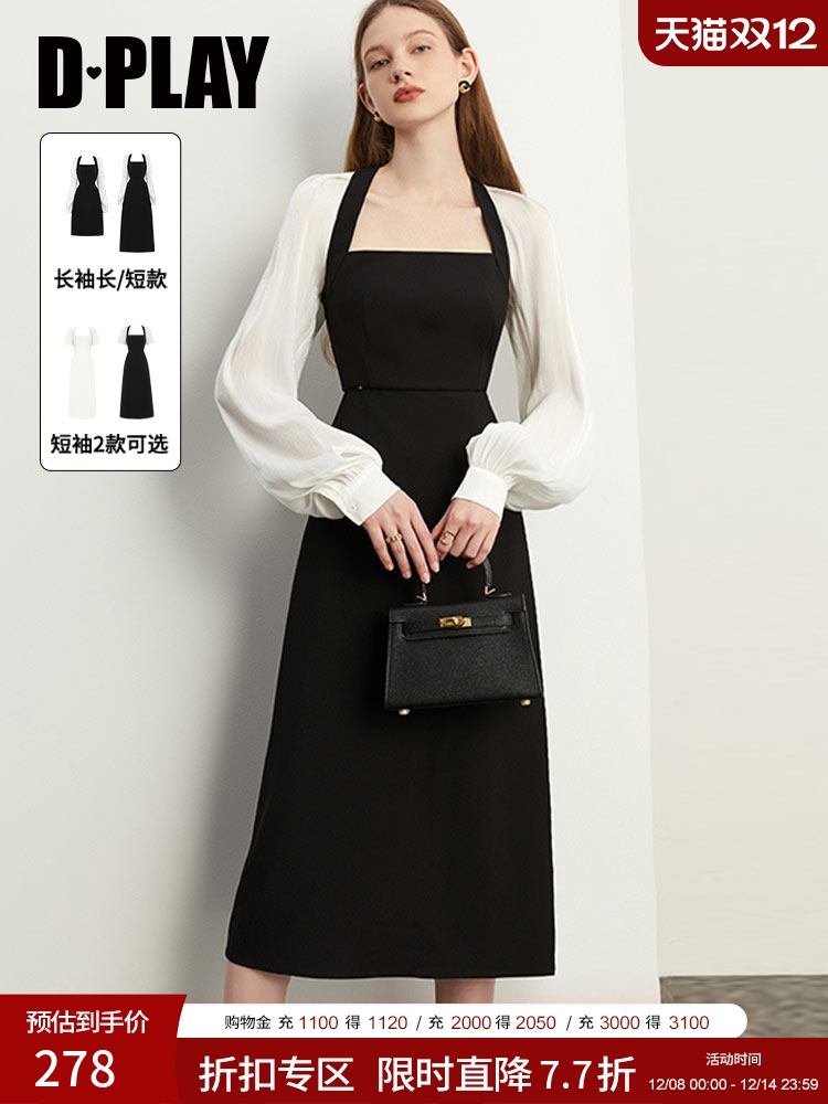 Autumn DPLAY2025, black and white long-sleeved dress, women's French light dress, gilt gauze long skirt, little black dress