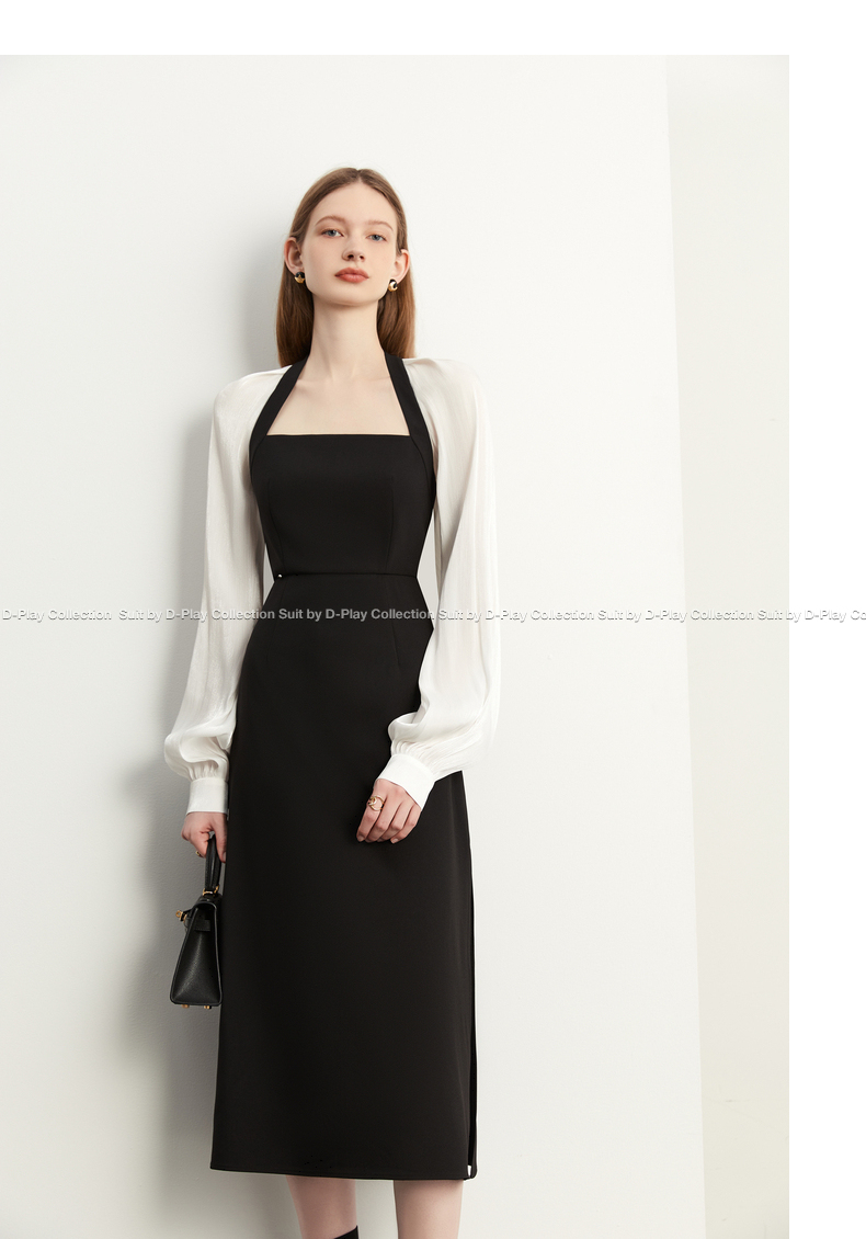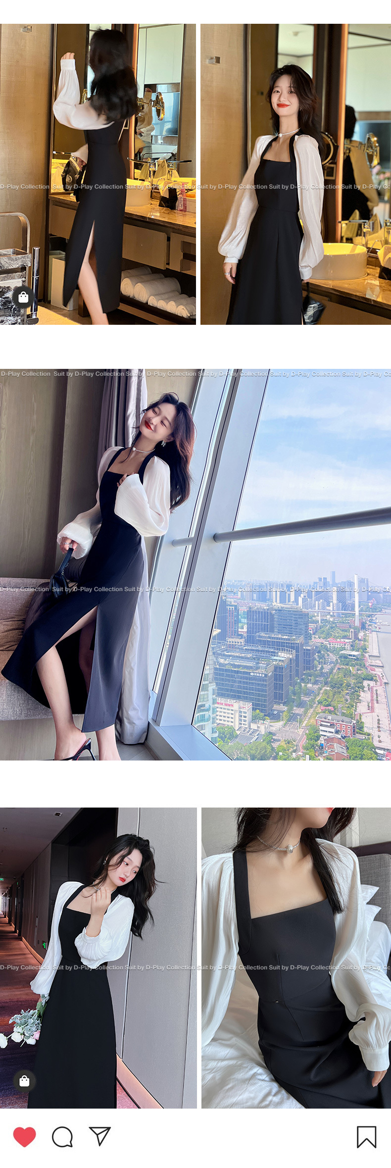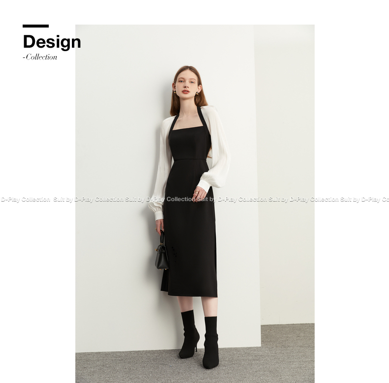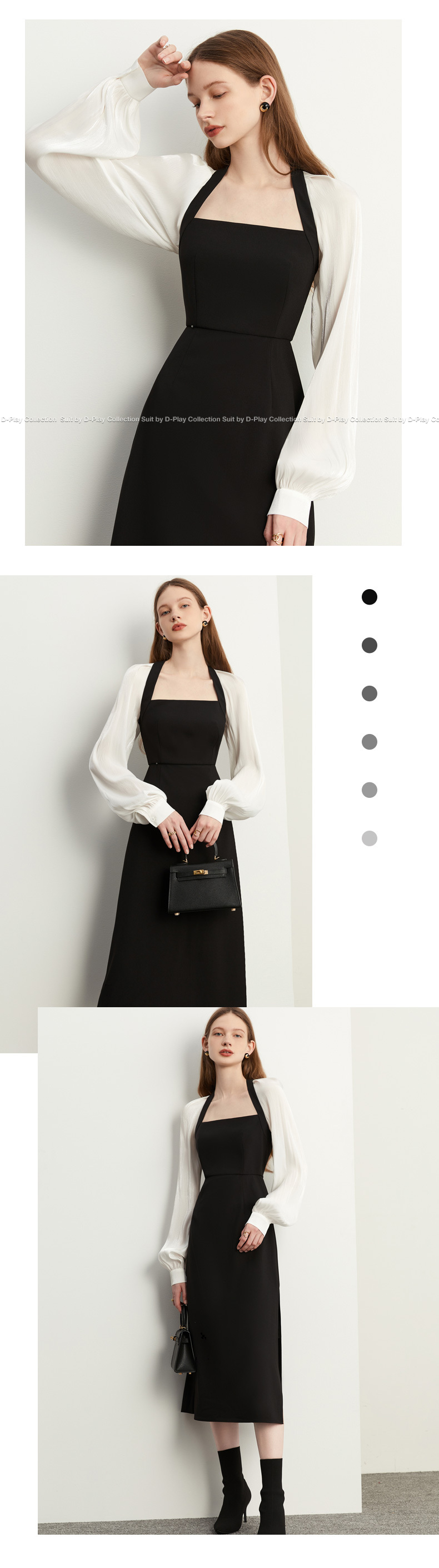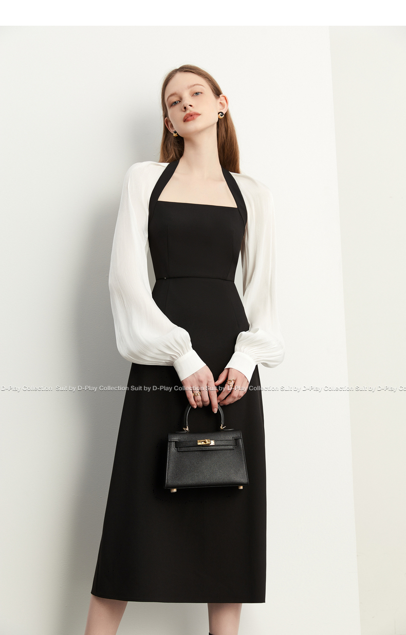 Autumn DPLAY2025, black and white long-sleeved dress, women's French light dress, gilt gauze long skirt, little black dress