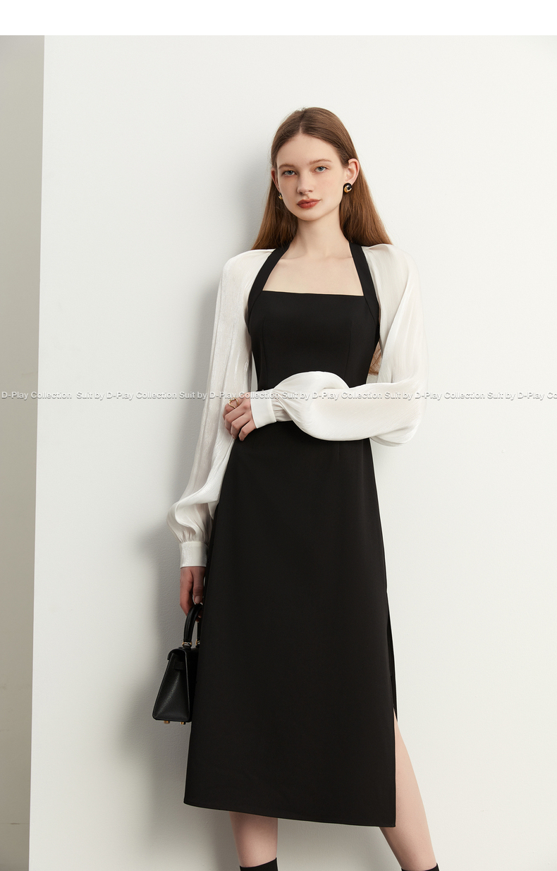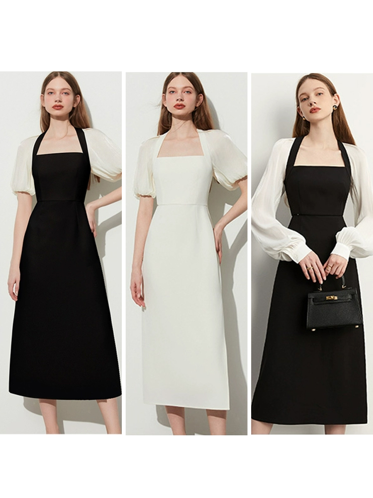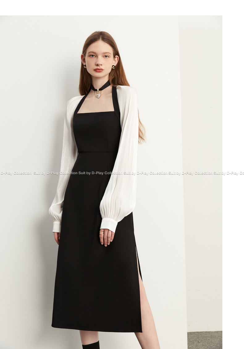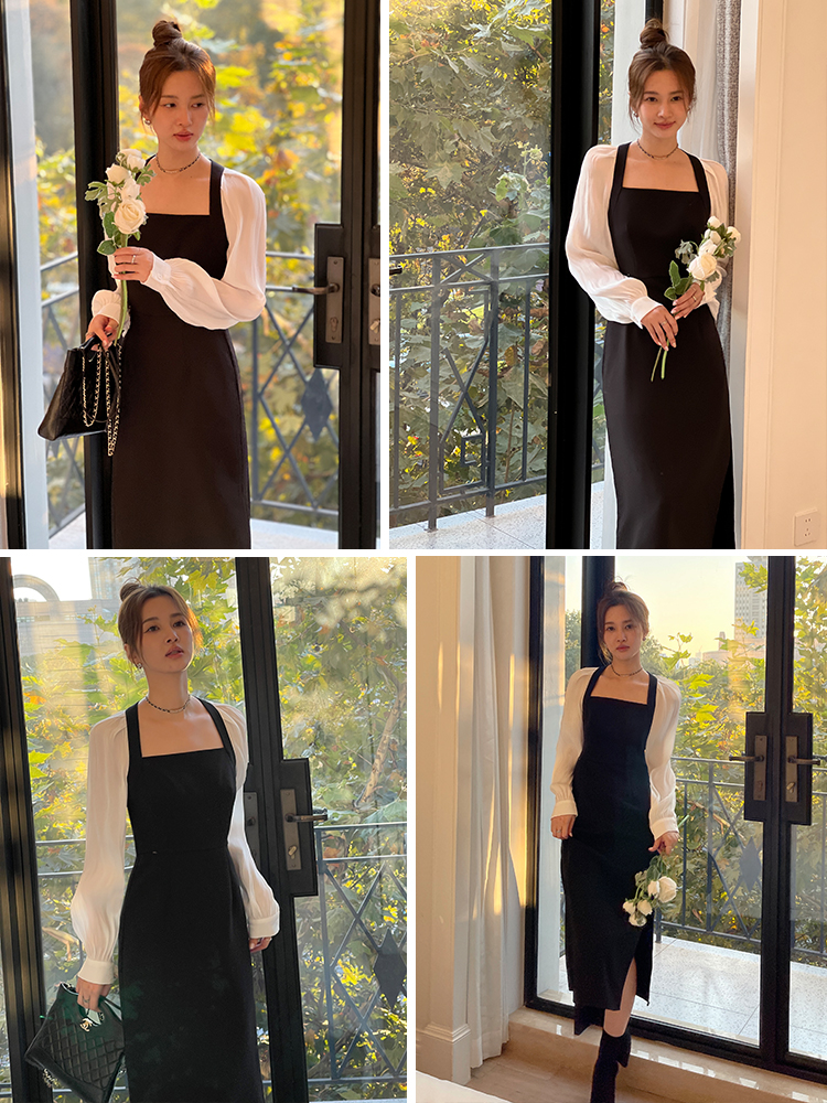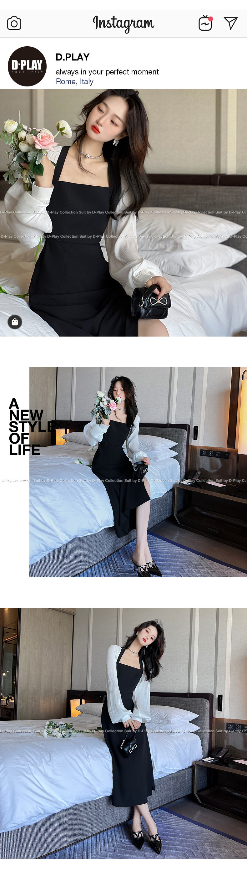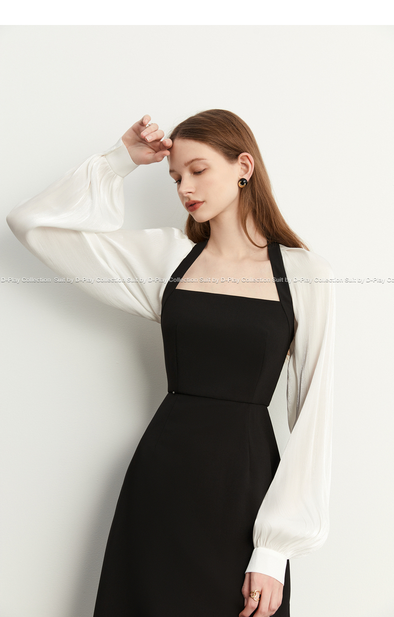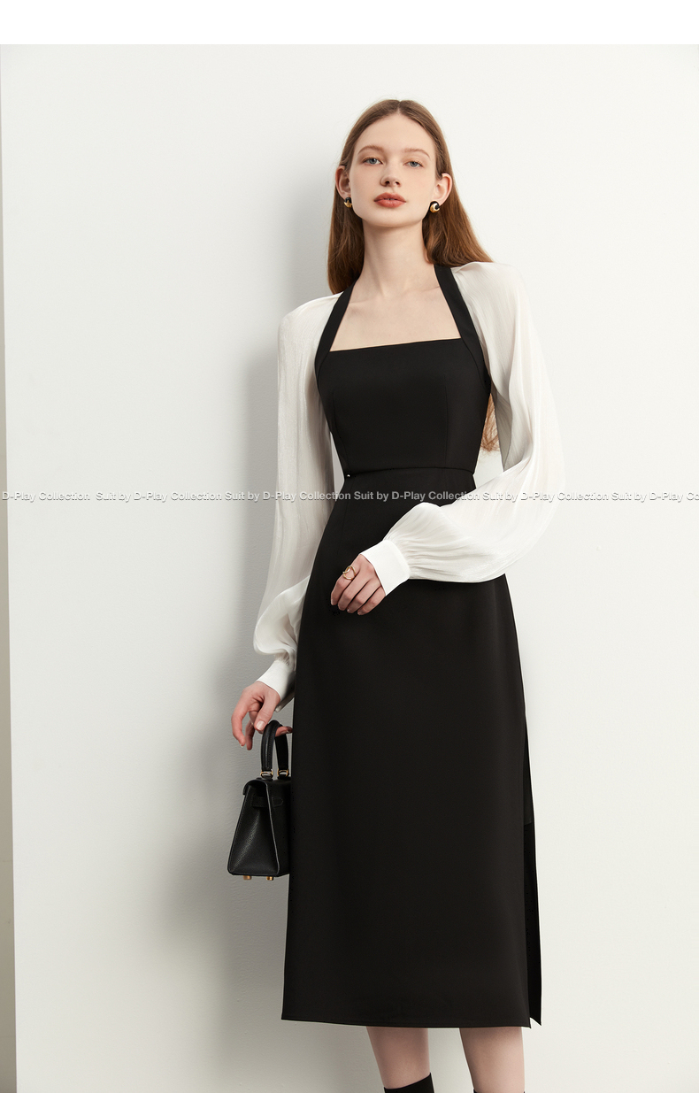 Autumn DPLAY2025, black and white long-sleeved dress, women's French light dress, gilt gauze long skirt, little black dress