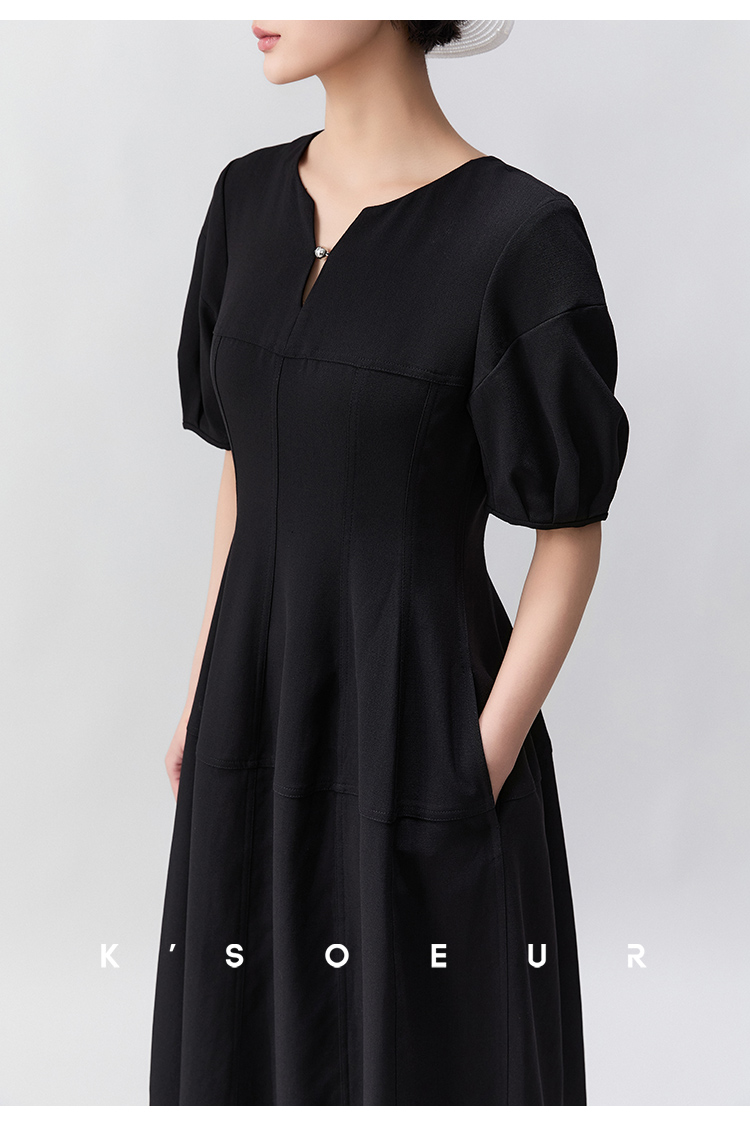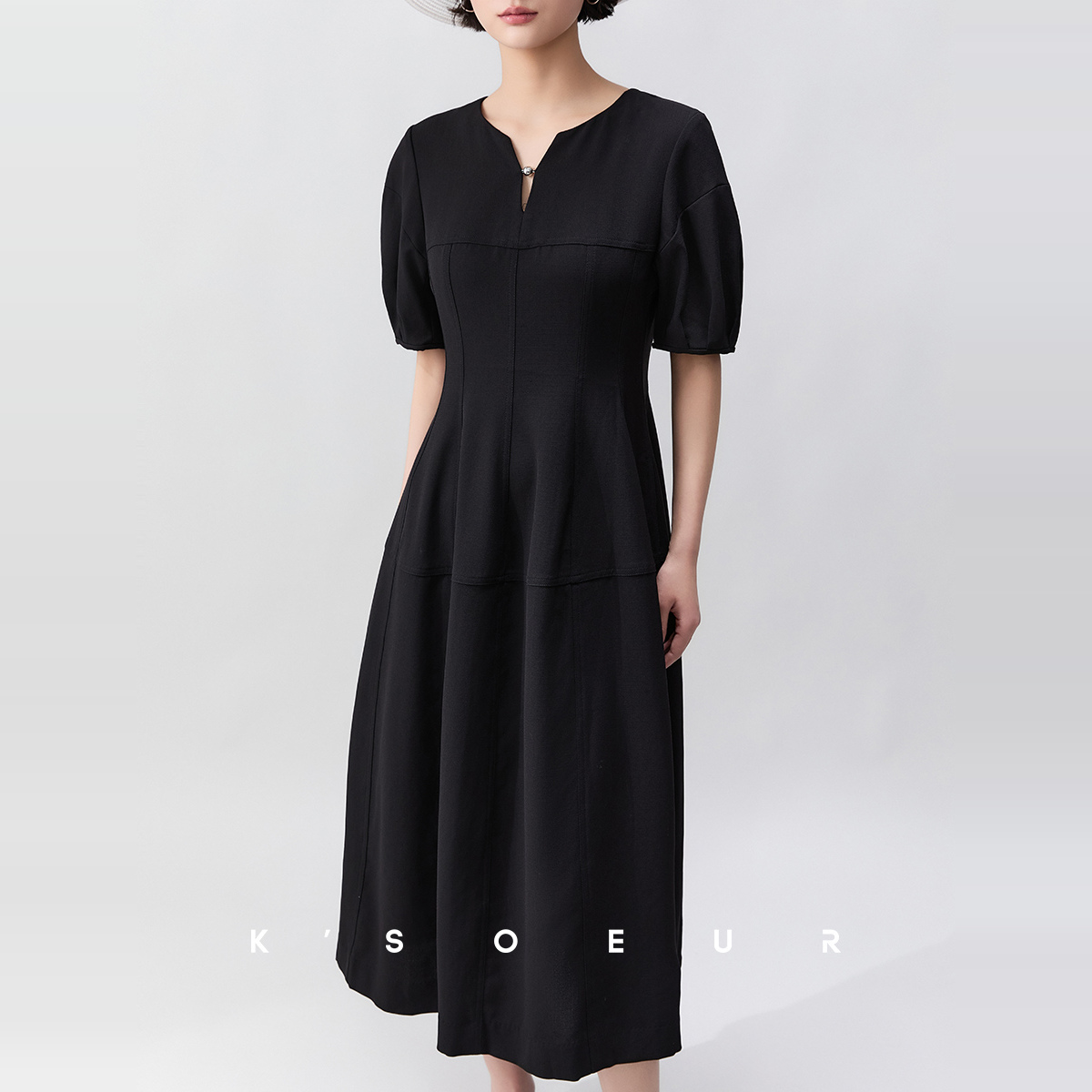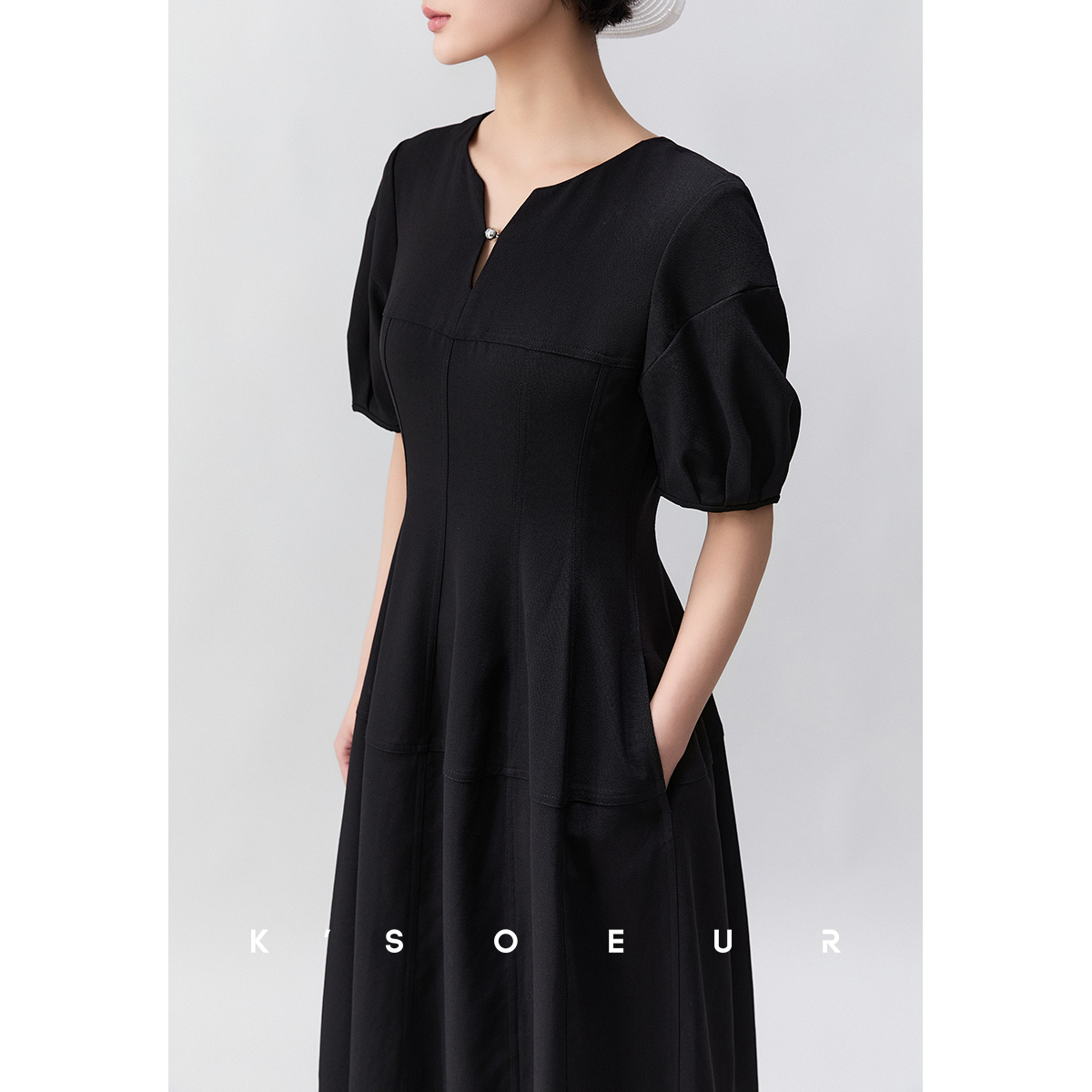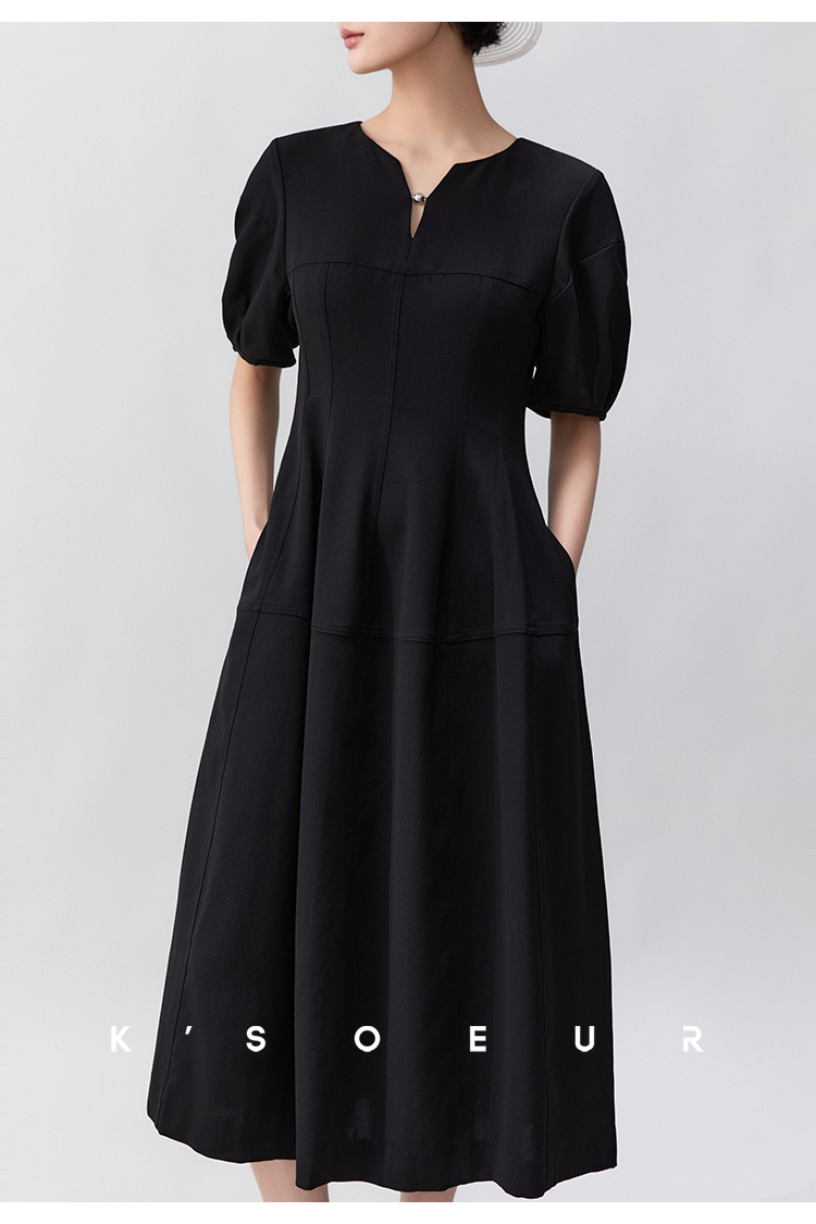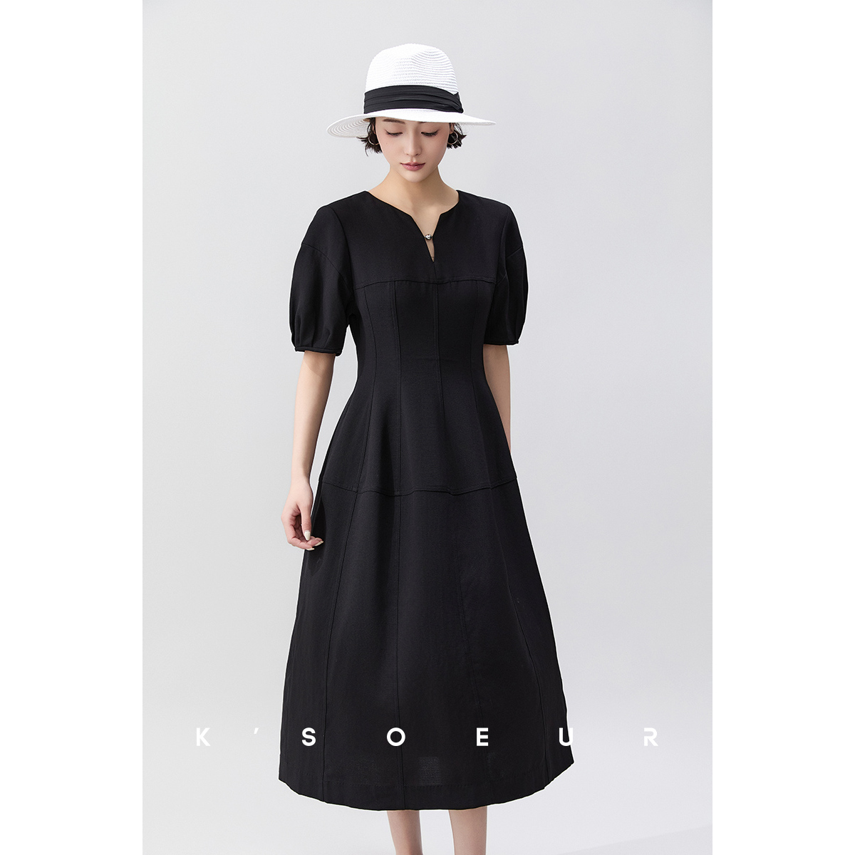 Sister K KSOEUR [heavy hemp acetate little black dress] round V neck balloon sleeve little black dress dress women