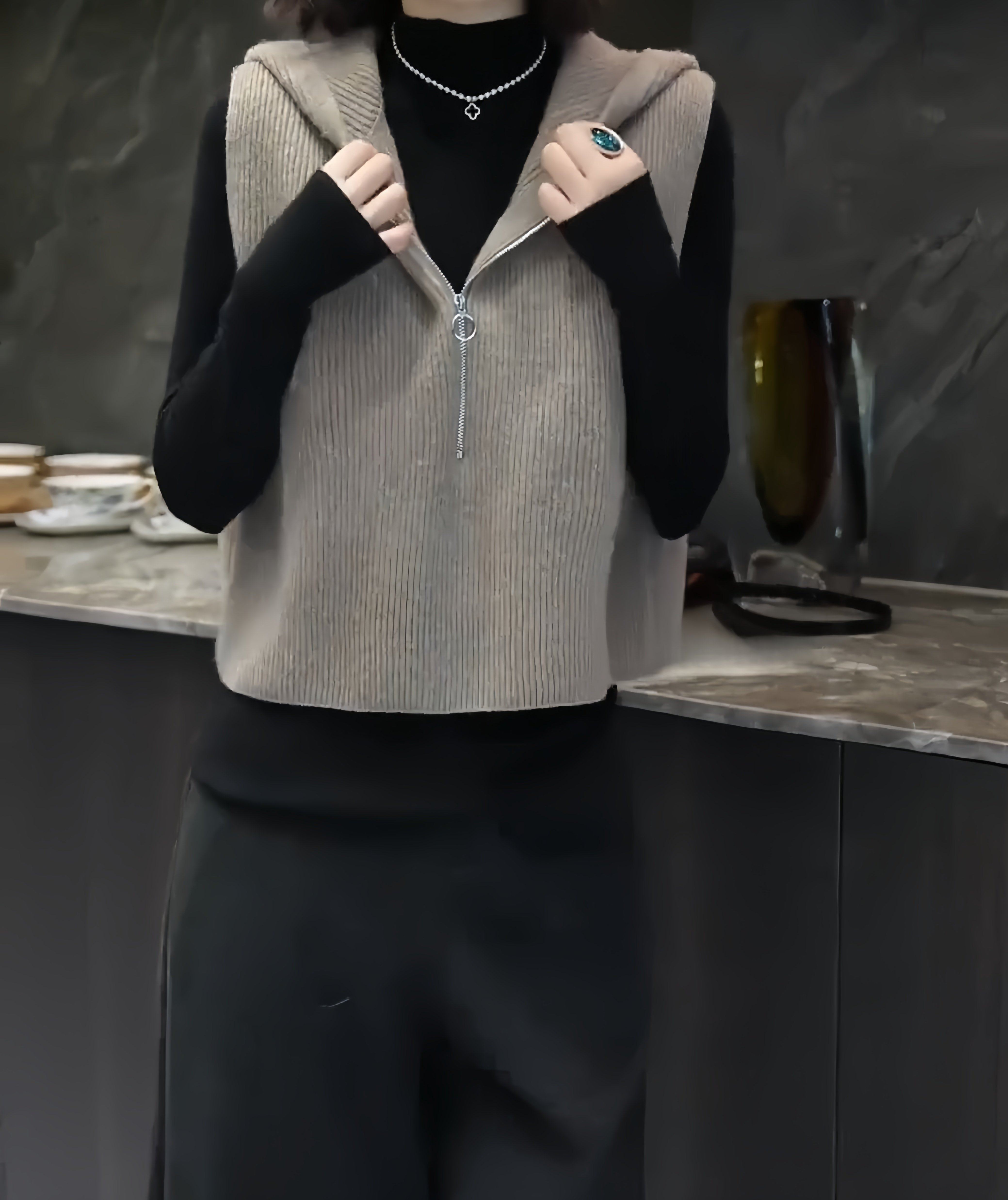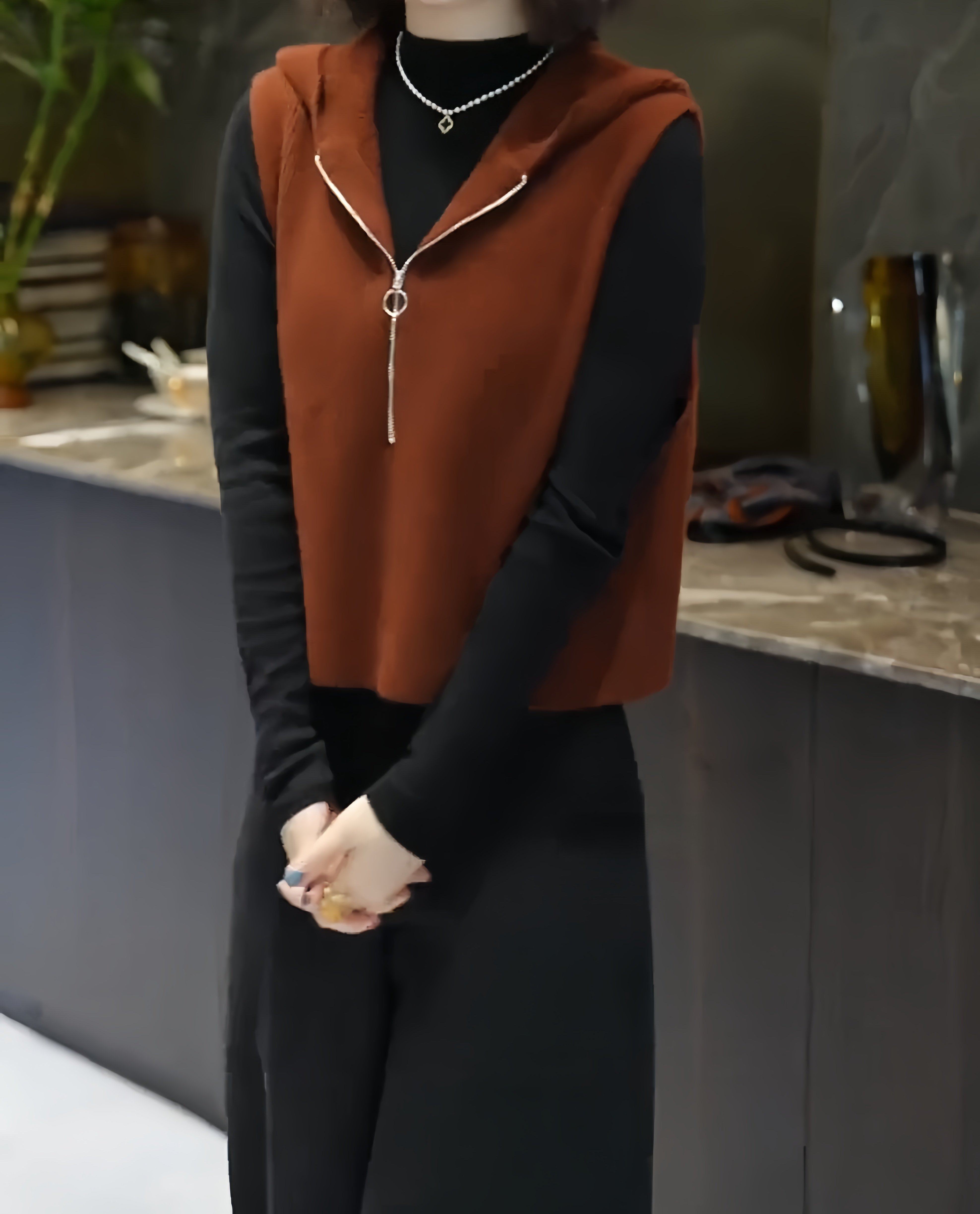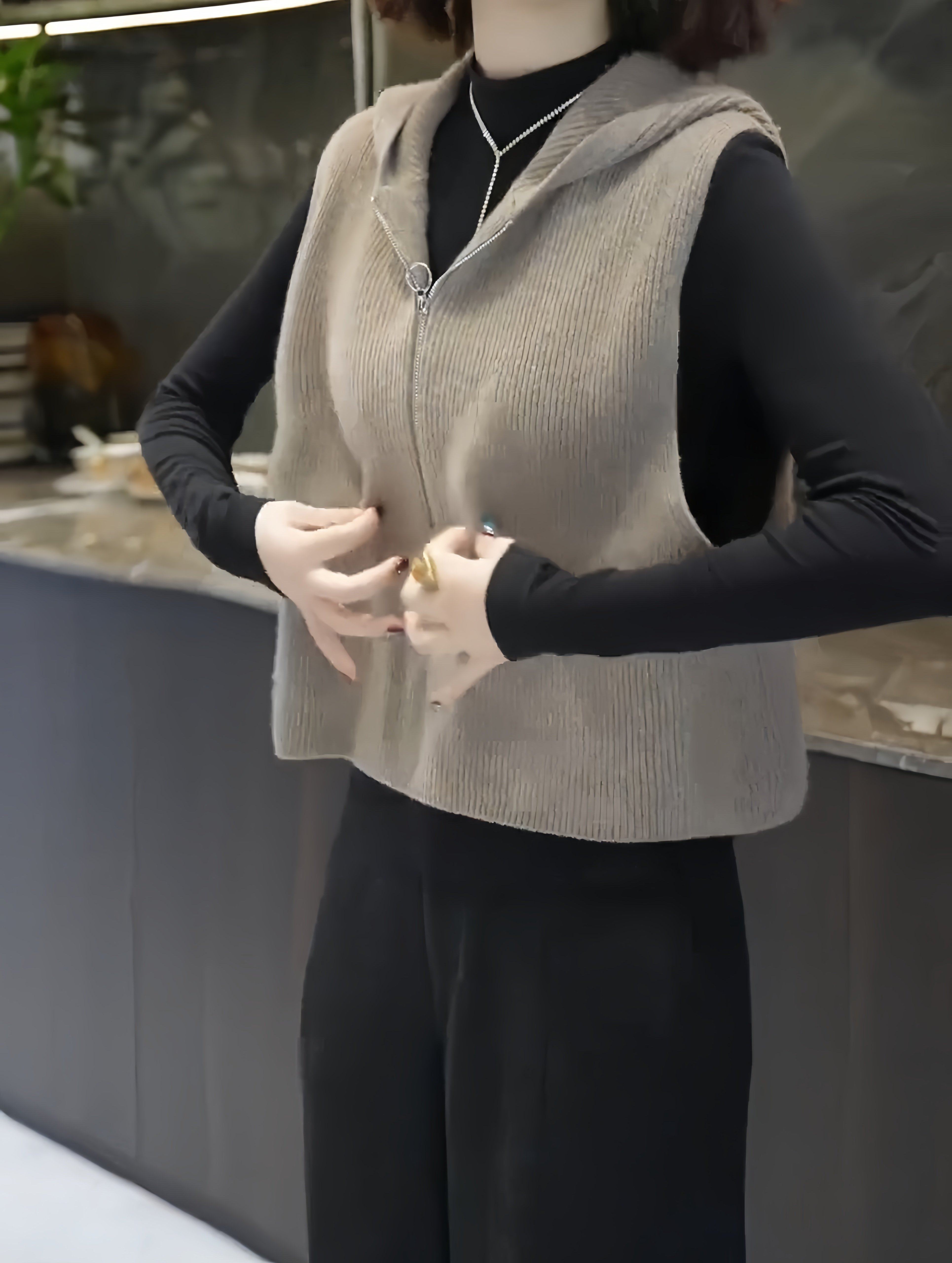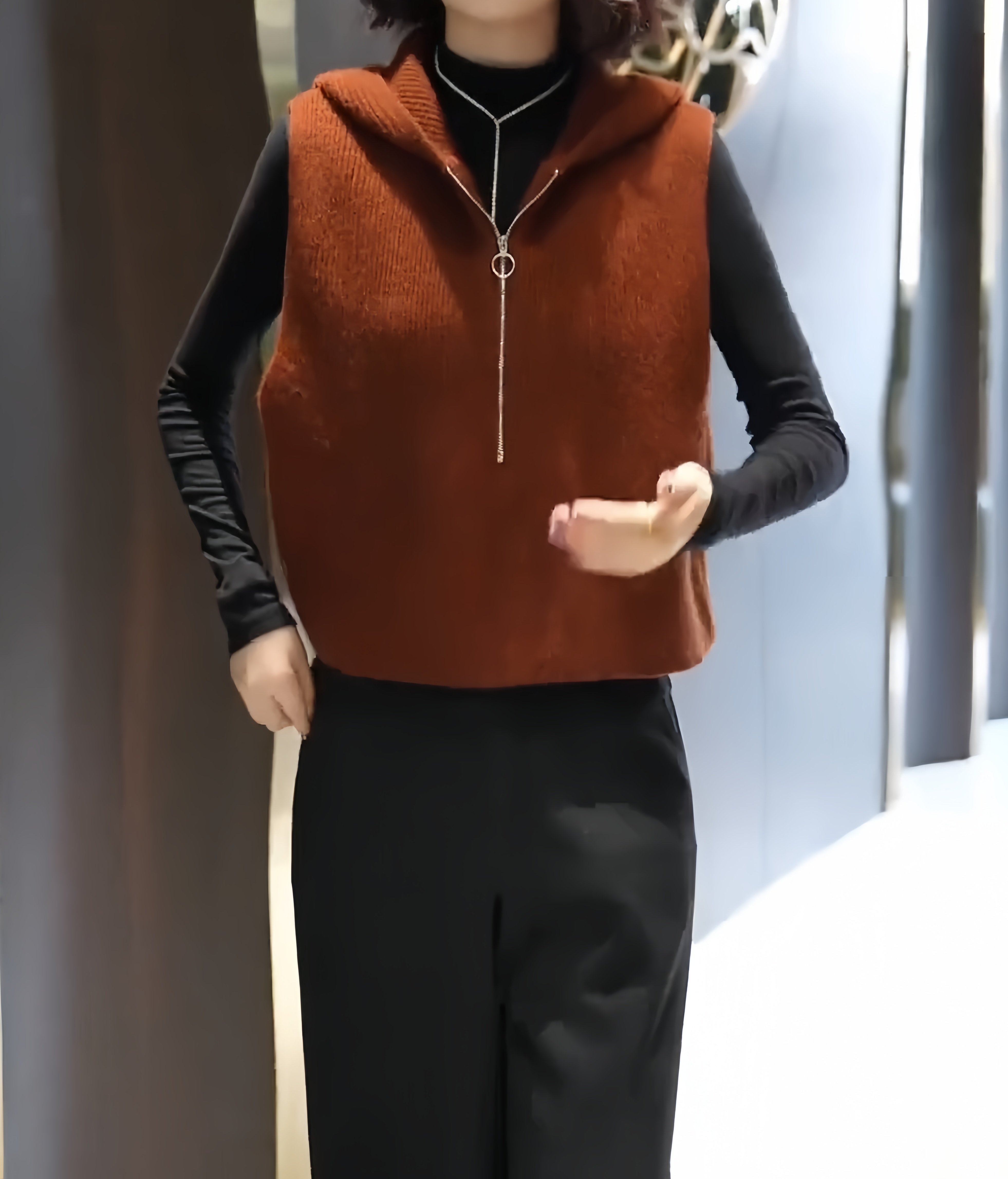 European high-end fashion age-reducing solid color sleeveless knitted vest hooded design horse clip top 2025 autumn/winter model