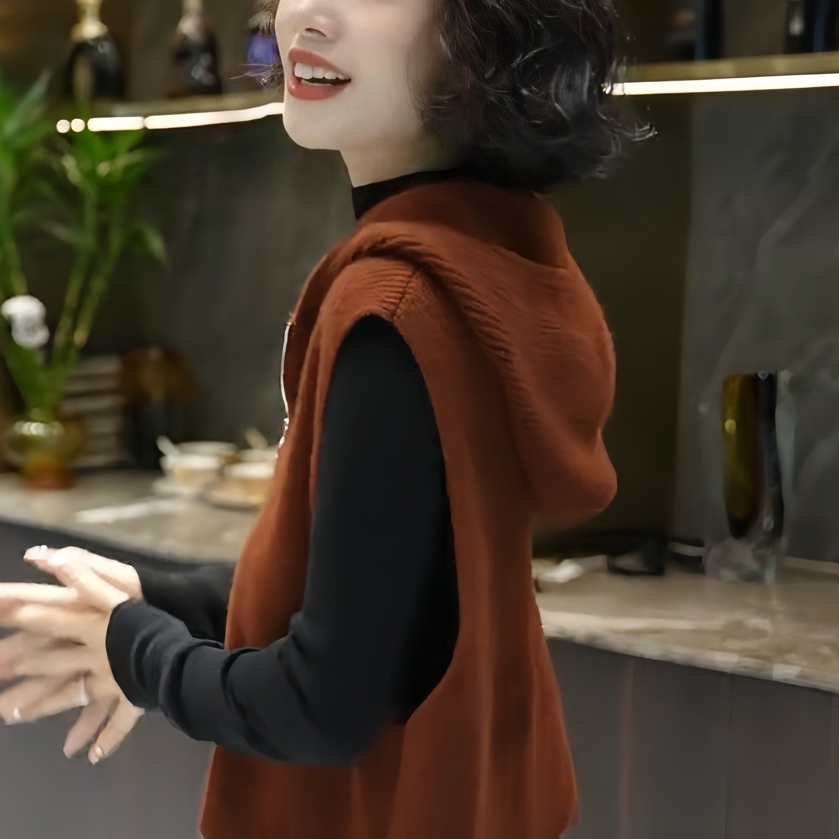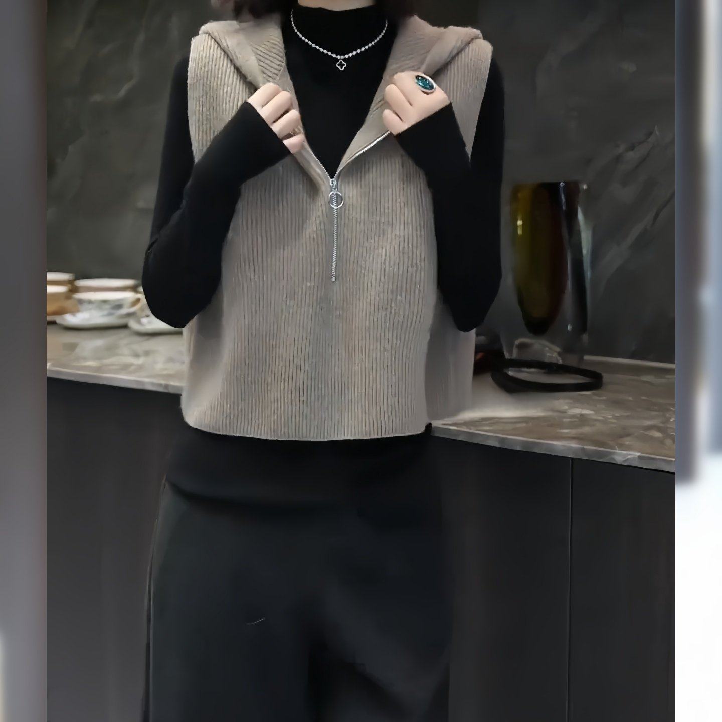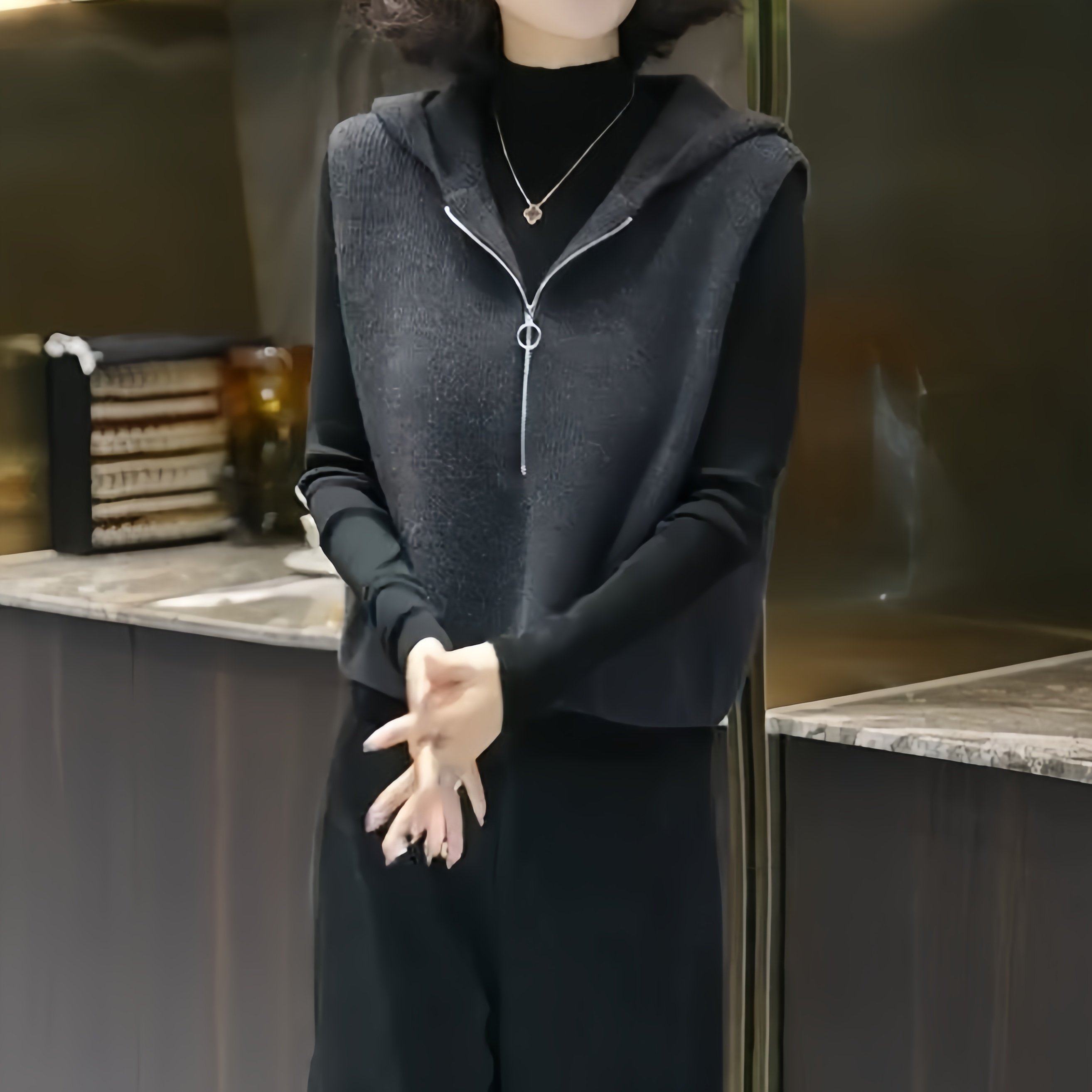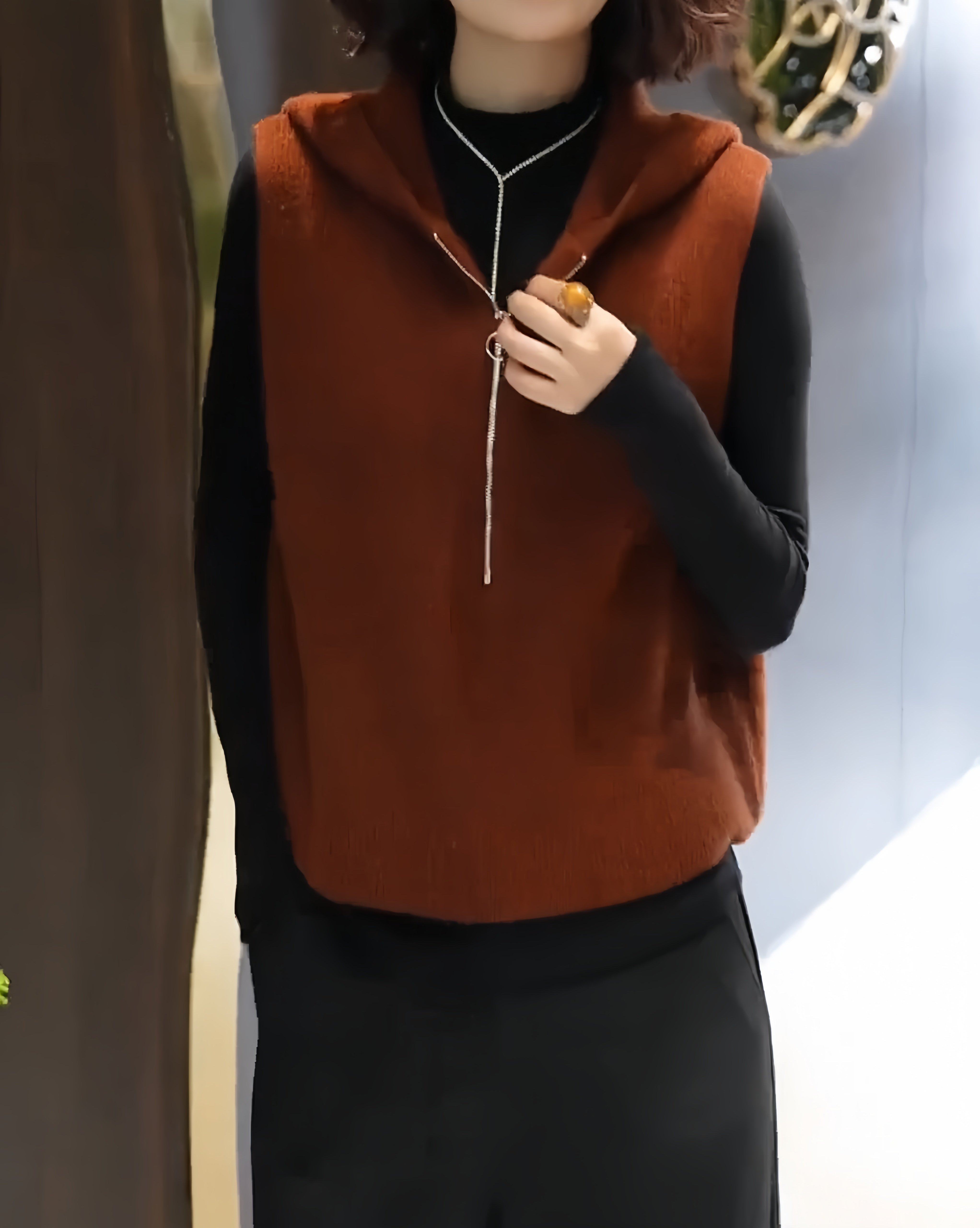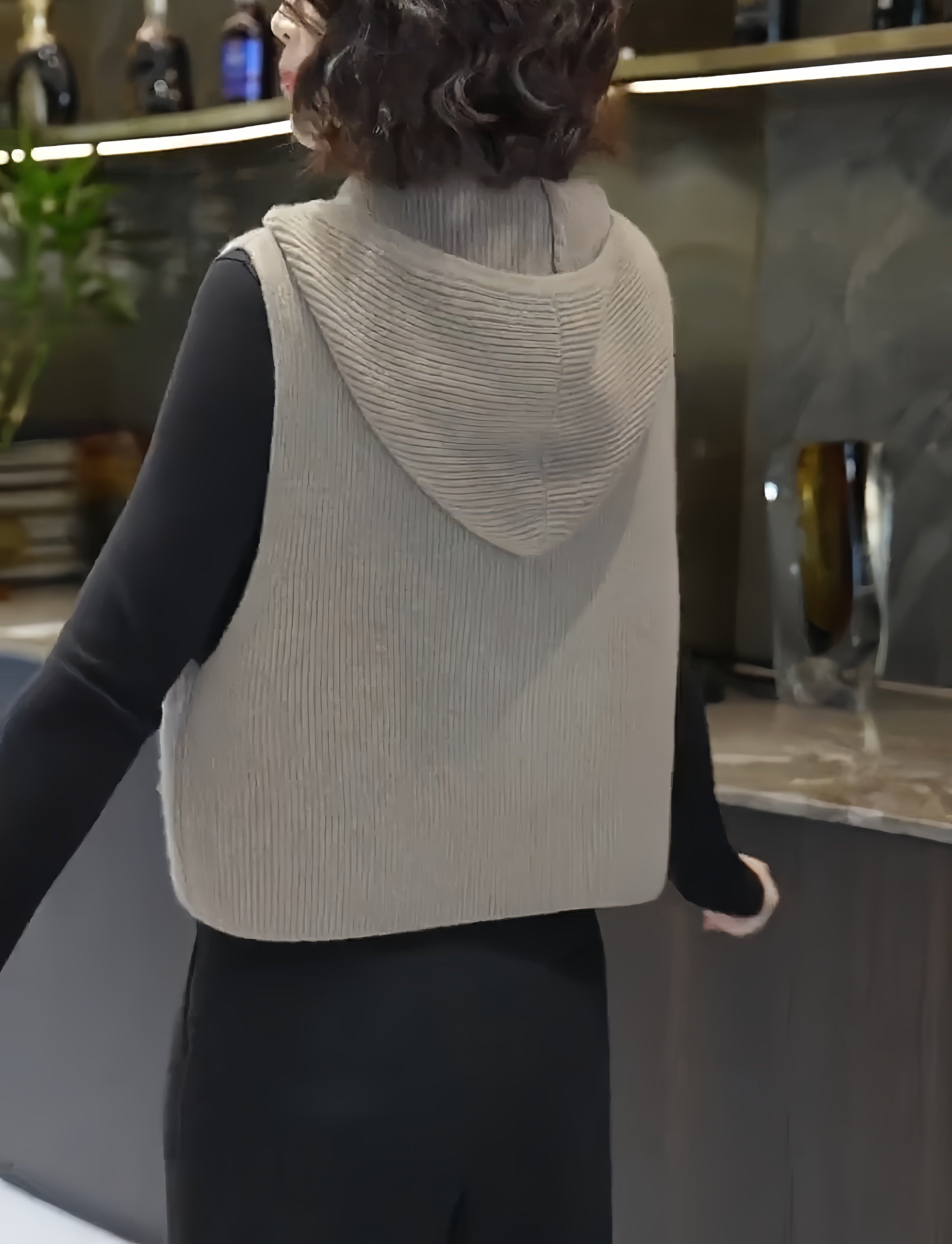 European high-end fashion age-reducing solid color sleeveless knitted vest hooded design horse clip top 2025 autumn/winter model