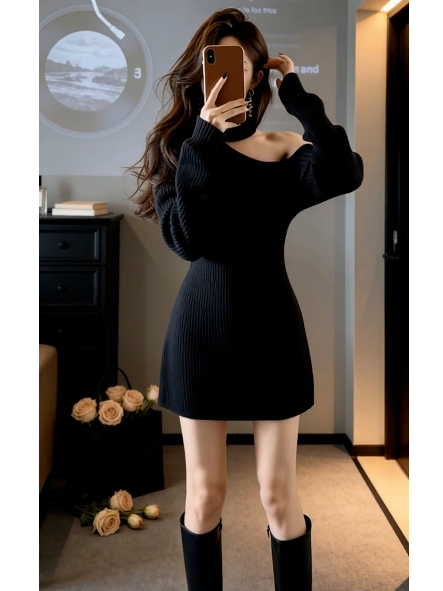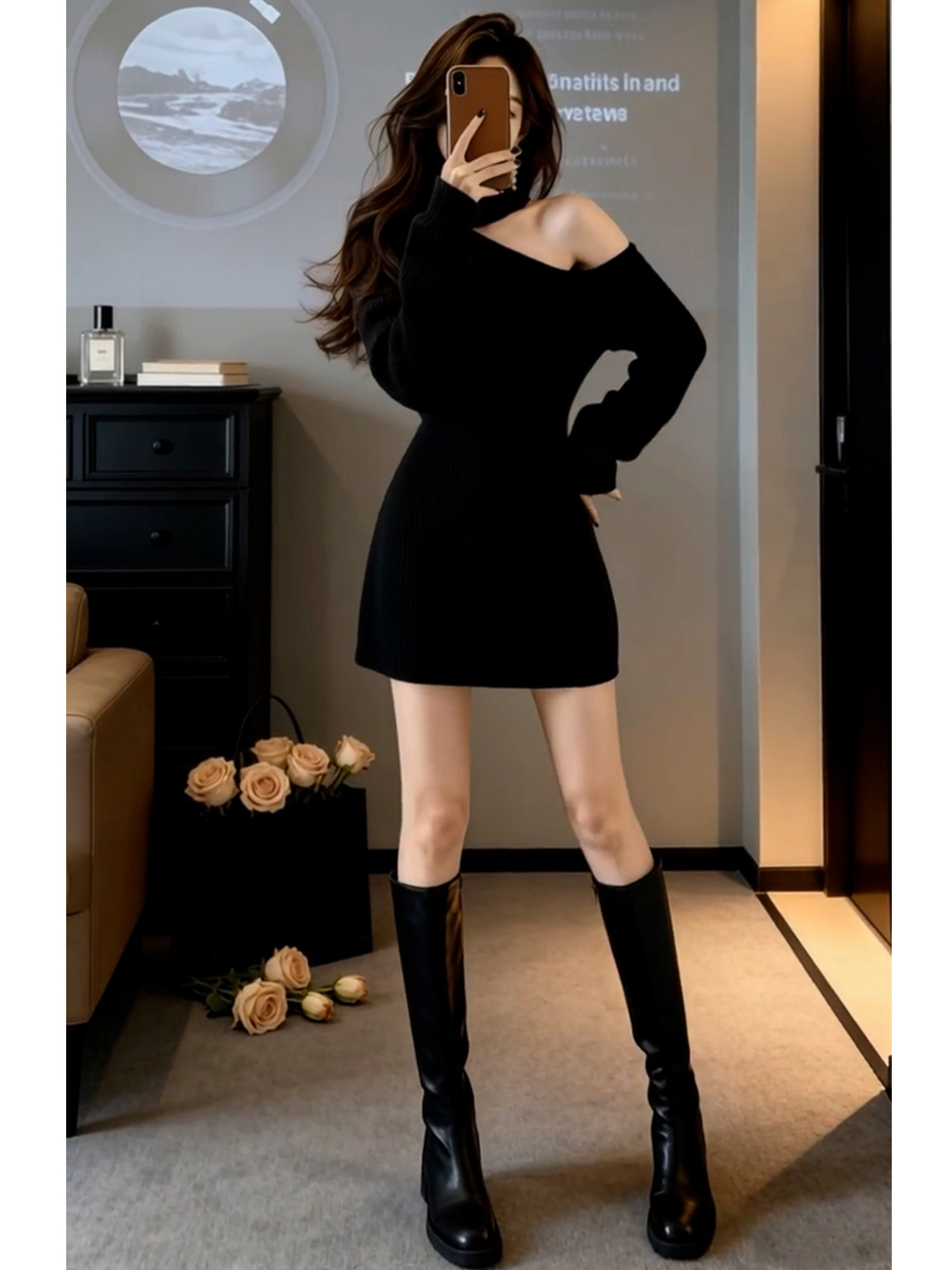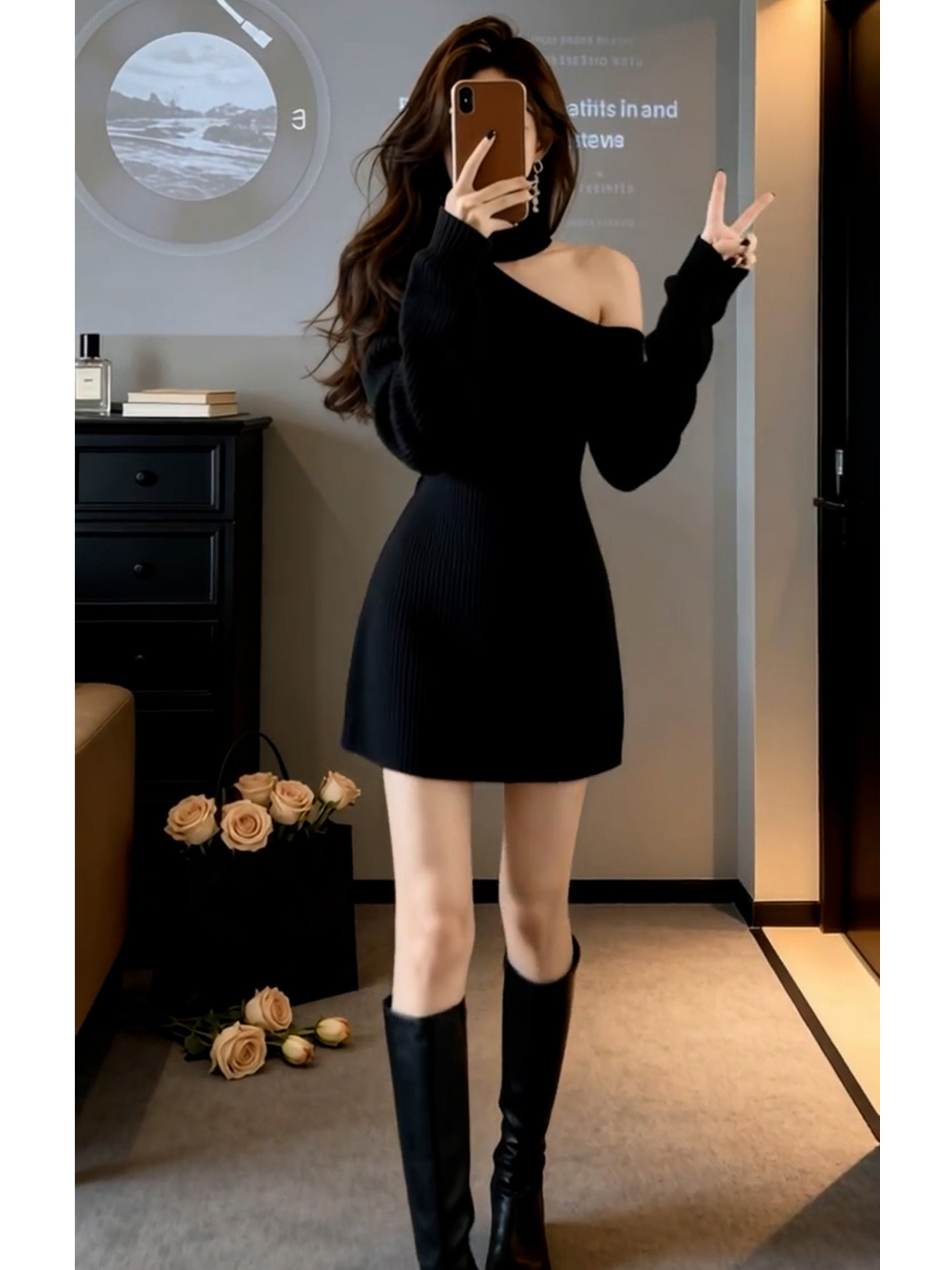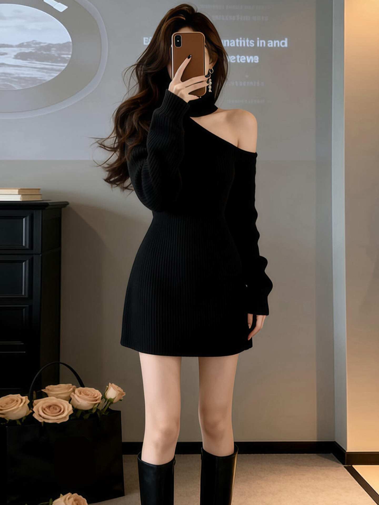 French Hepburn style black slanted shoulder knitted dress women's autumn/winter 2026 new small waist A-line skirt
