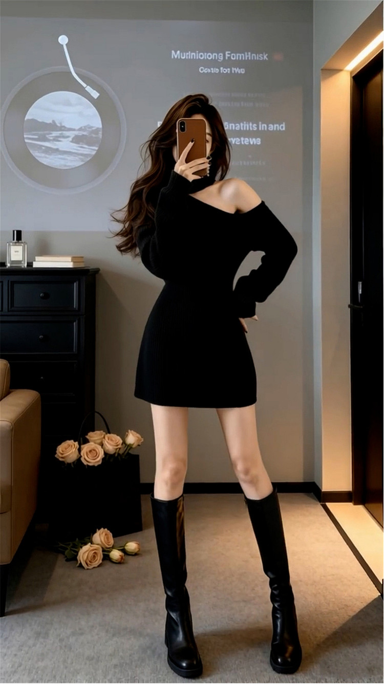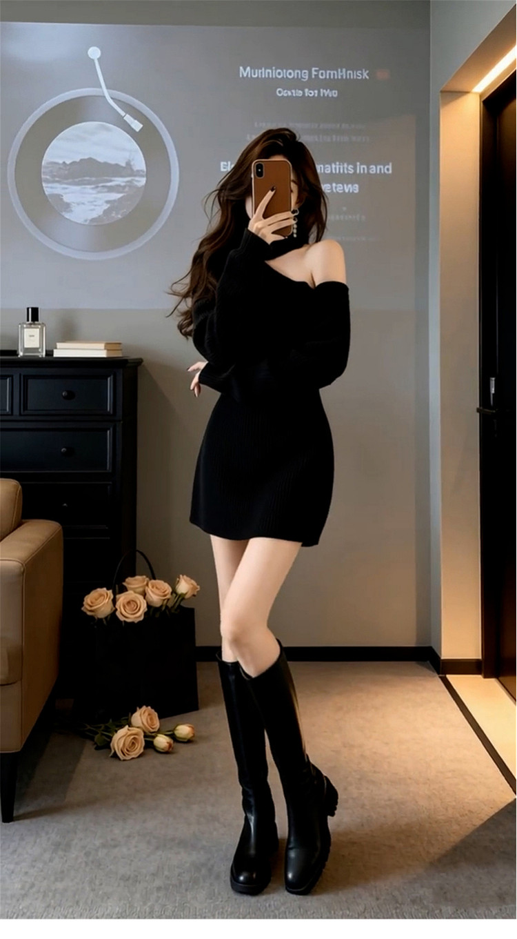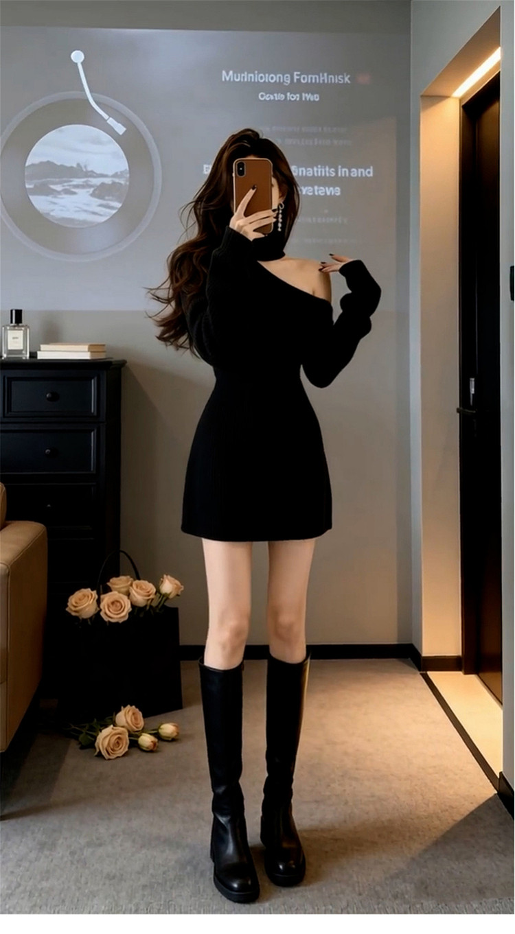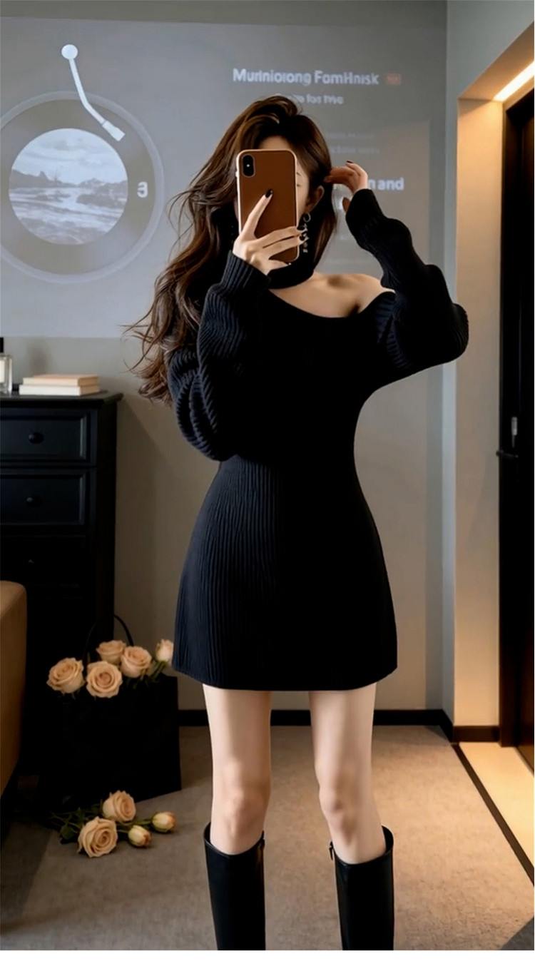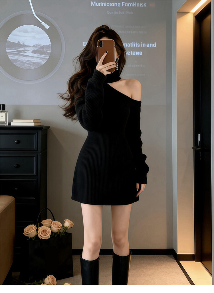 French Hepburn style black slanted shoulder knitted dress women's autumn/winter 2026 new small waist A-line skirt