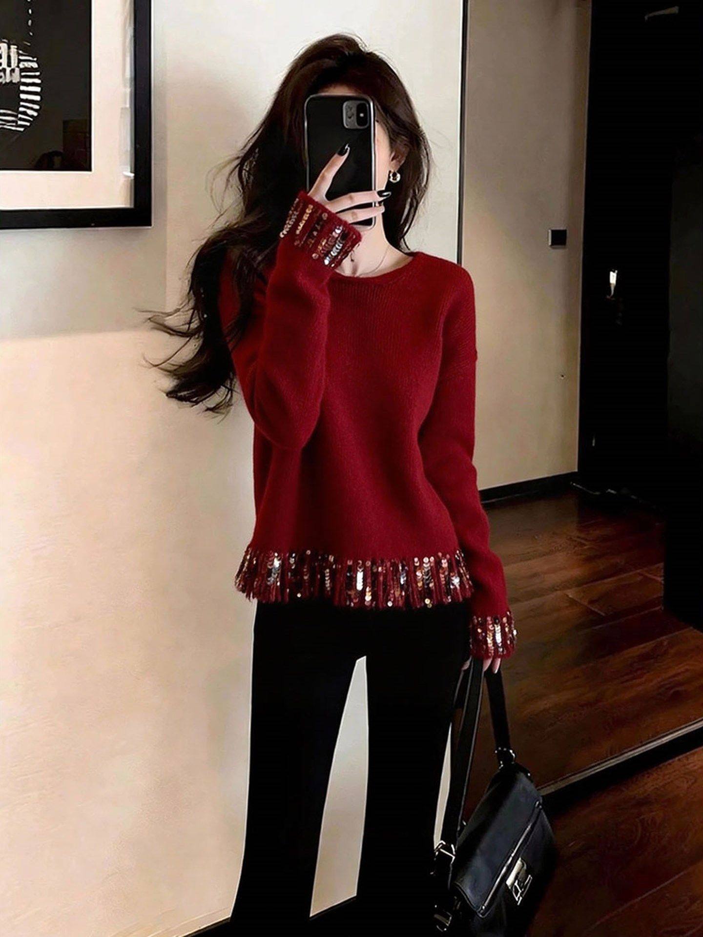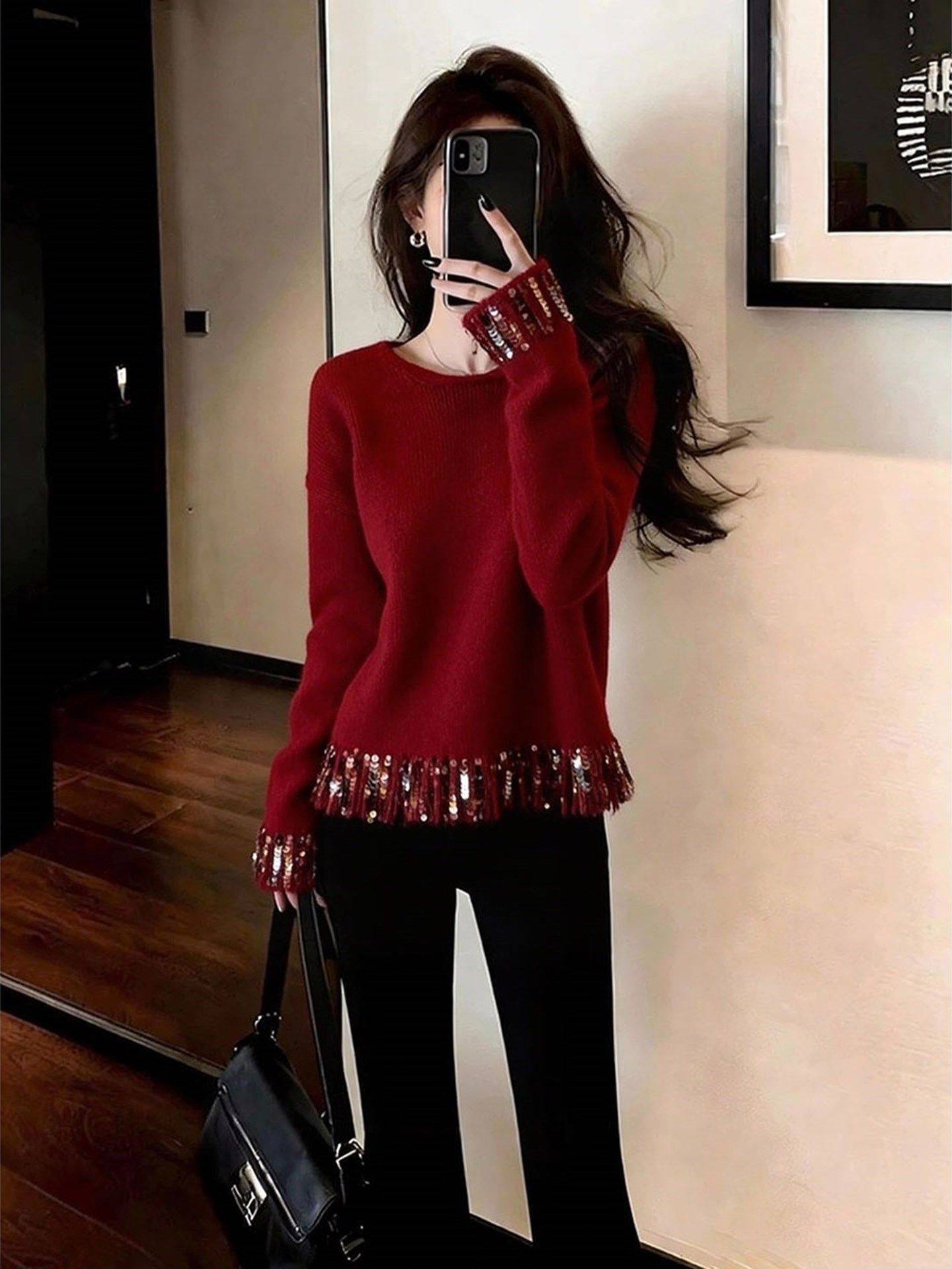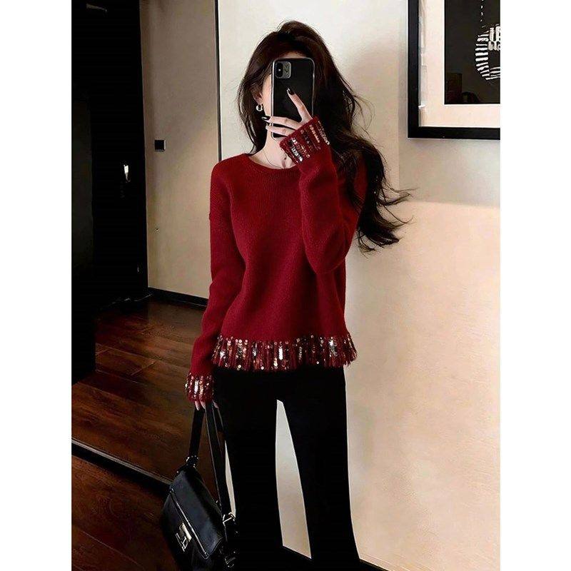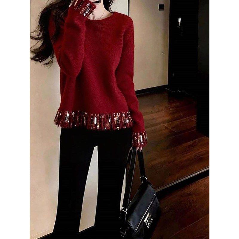 French high-end fine glitter red knitted sweater women's new fashionable and elegant and versatile top for winter 2025