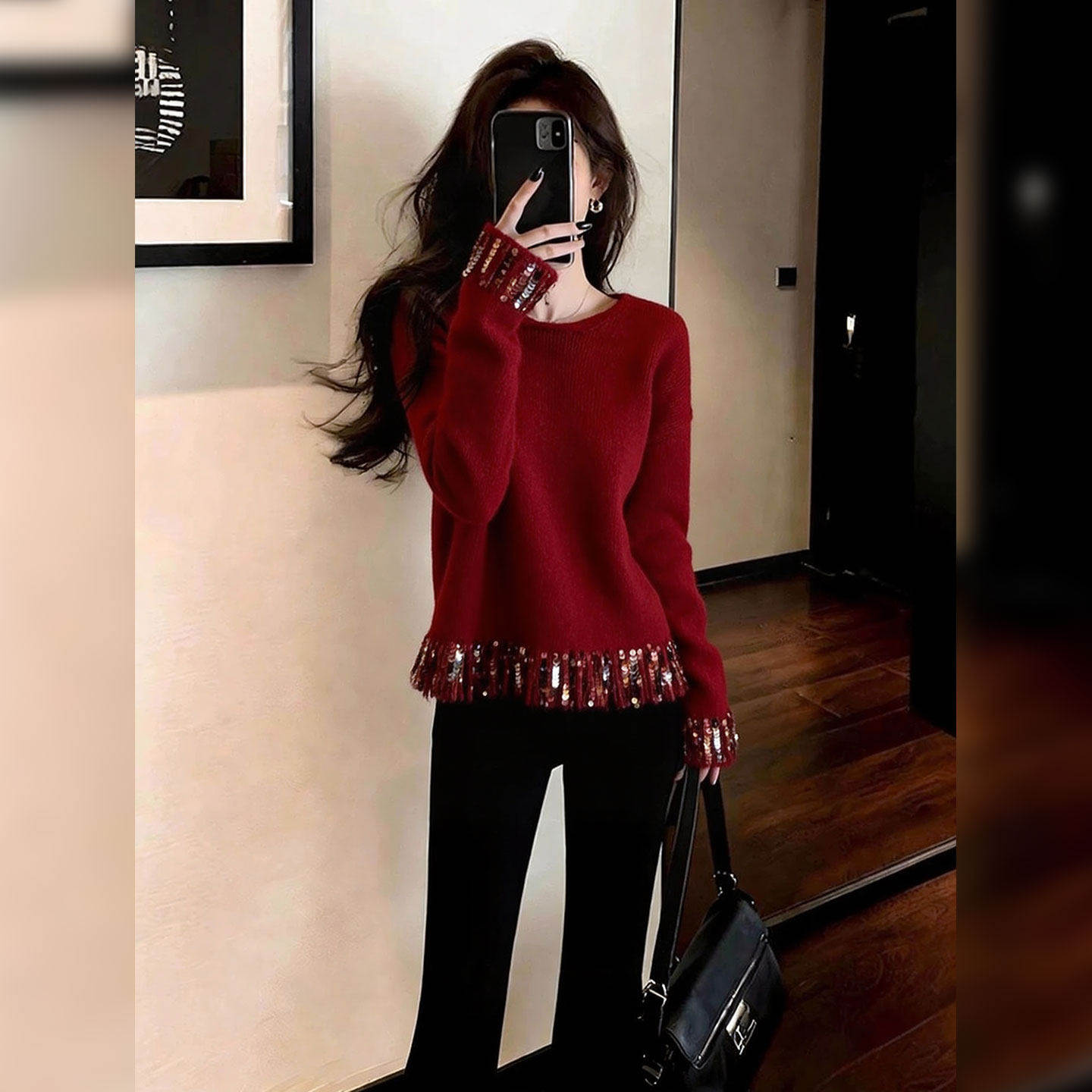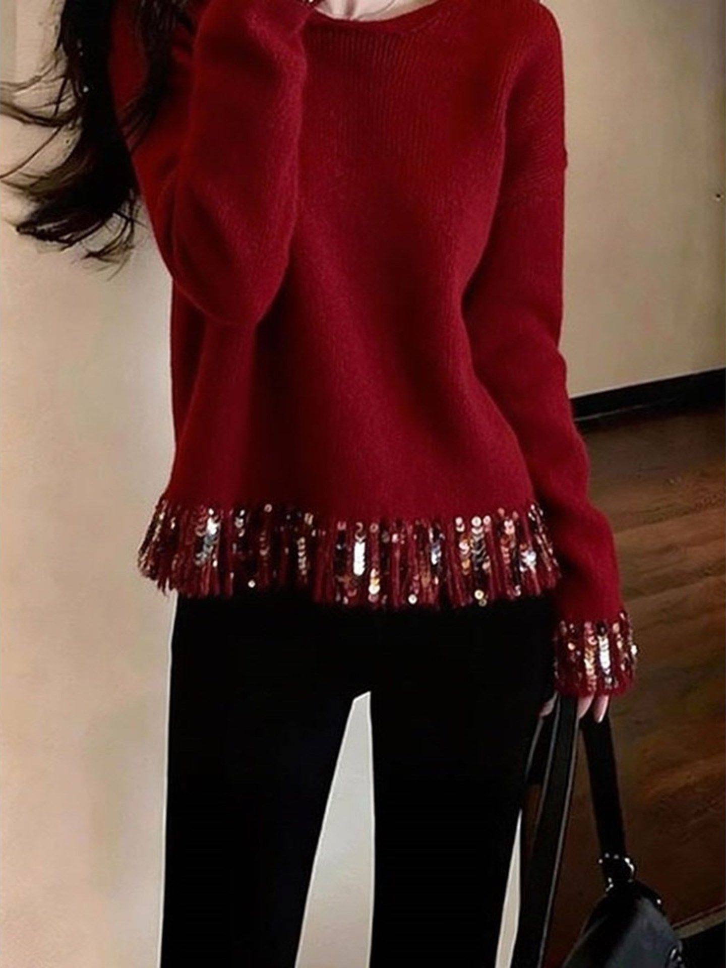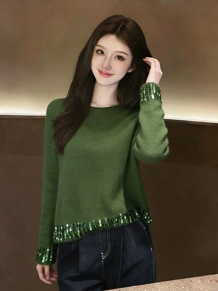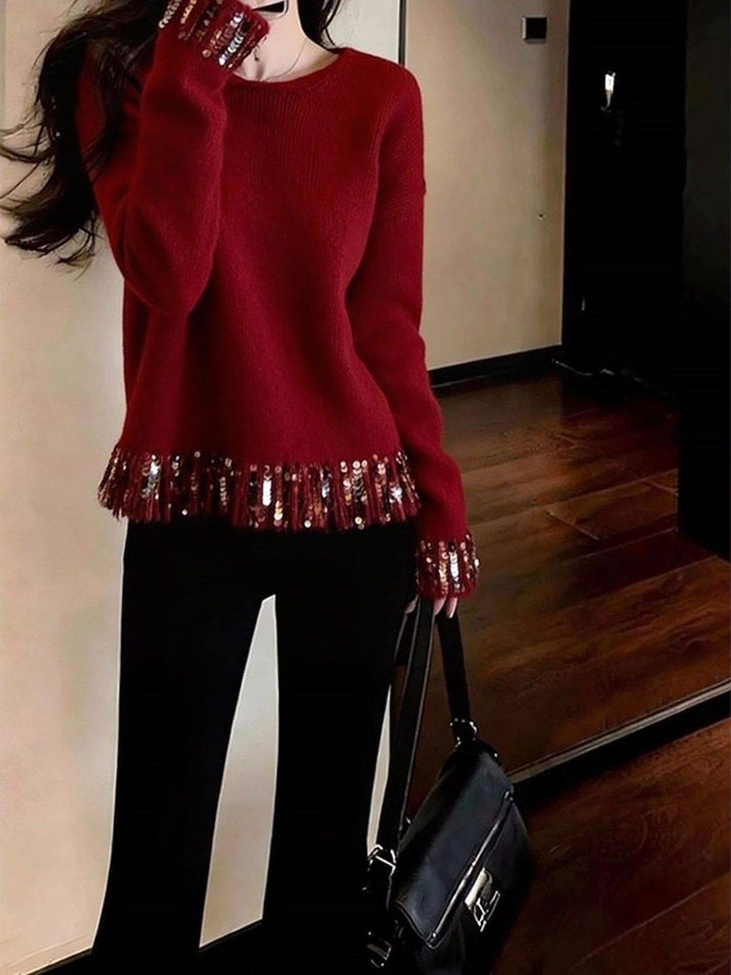 French high-end fine glitter red knitted sweater women's new fashionable and elegant and versatile top for winter 2025