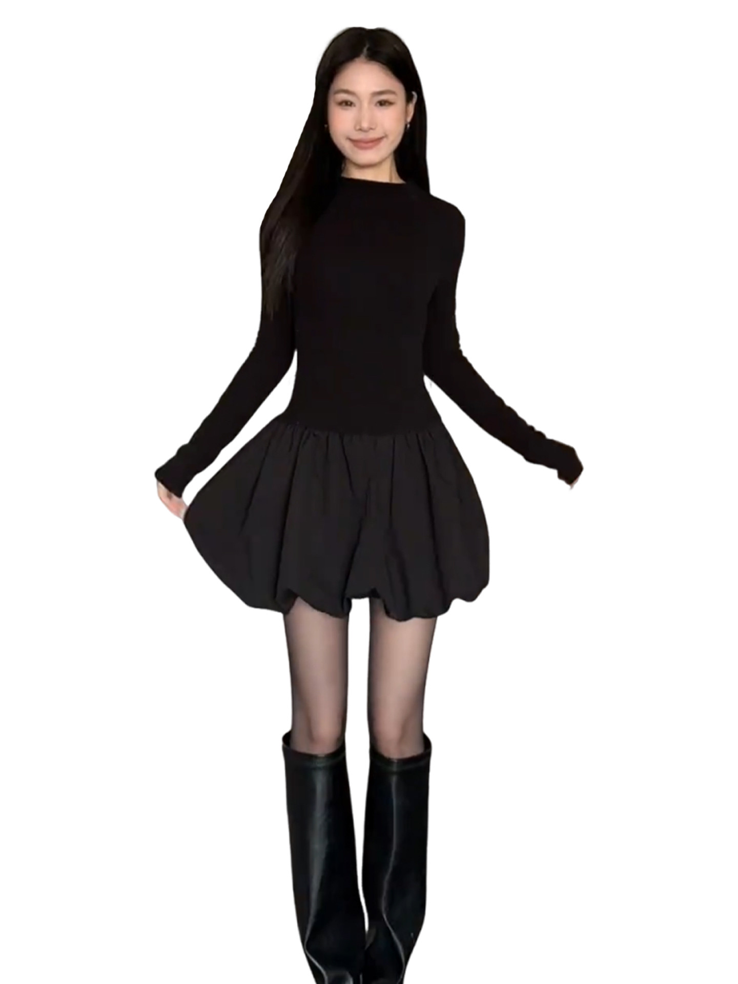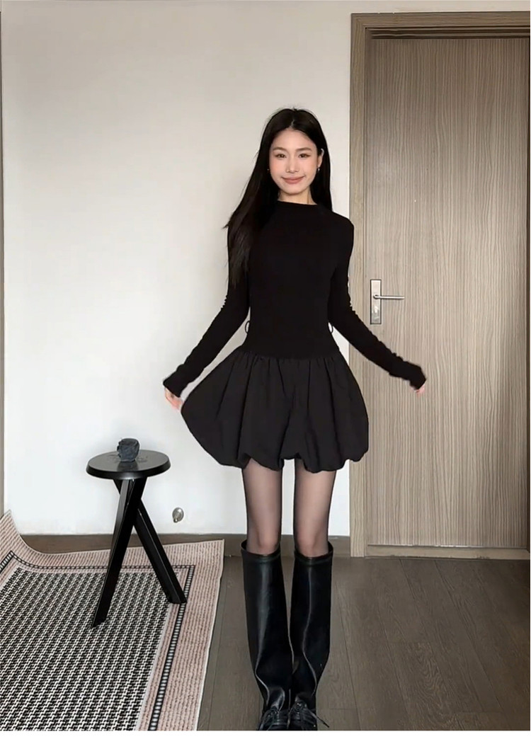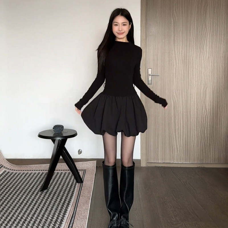 2026 new Hepburn-style black knitted dress women's autumn and winter small flower bud skirt with a waist-cinching short skirt inside