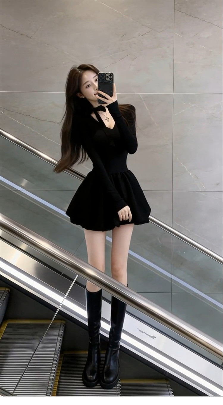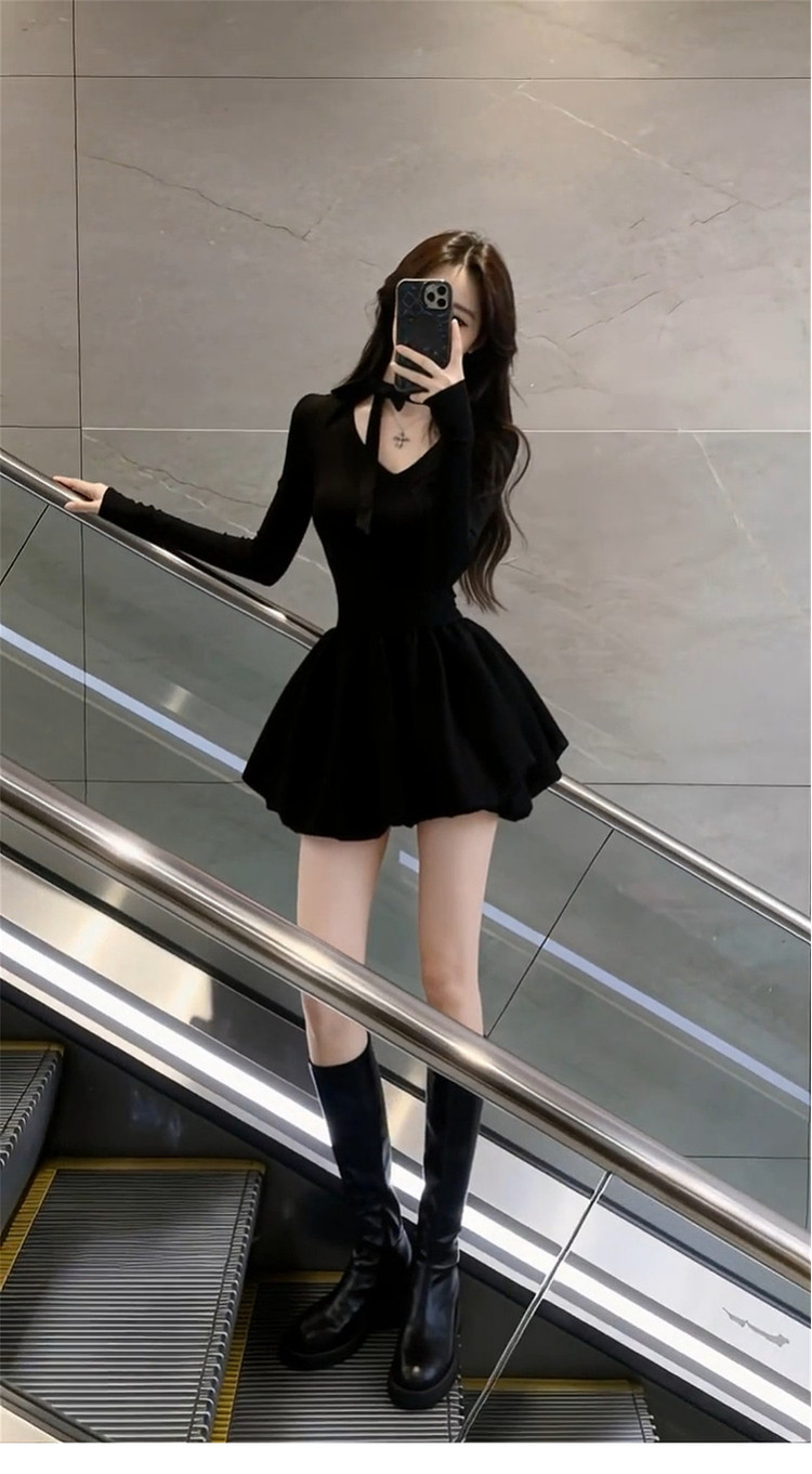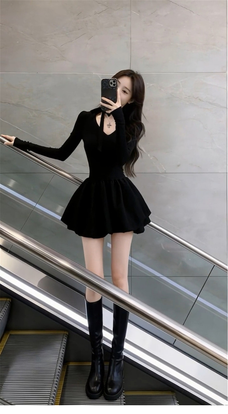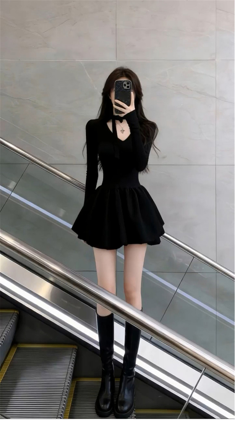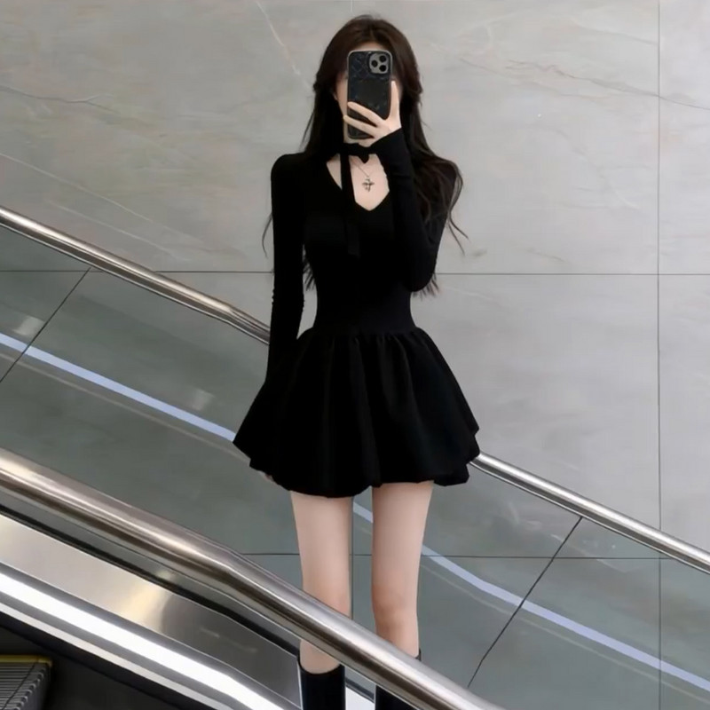 French Hepburn style black dress women's autumn/winter 2026 new small waist slimming A-line puffy skirt