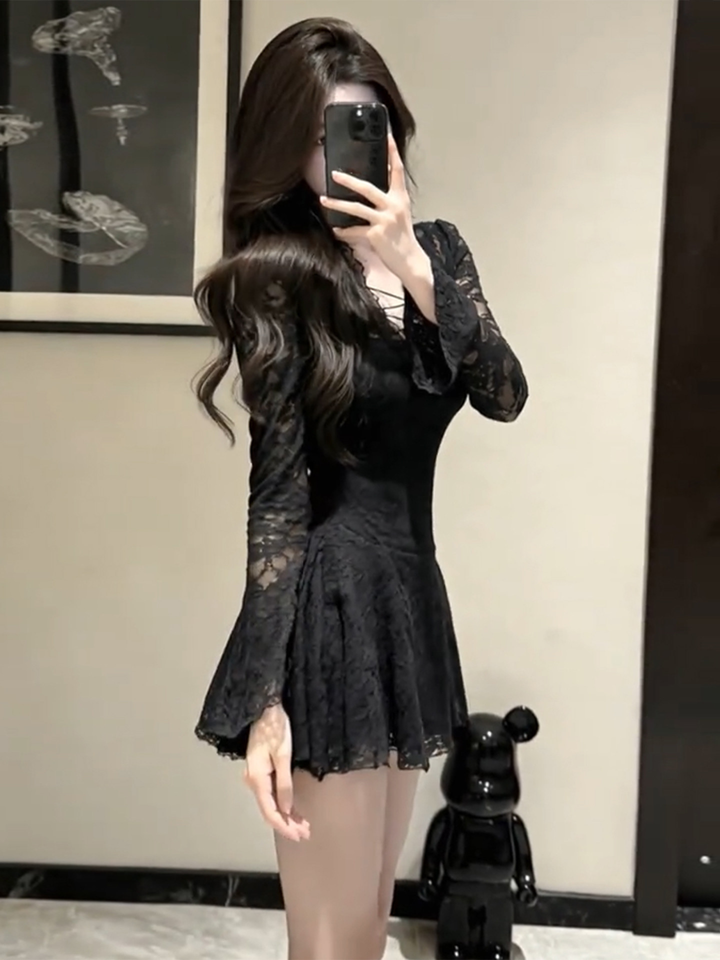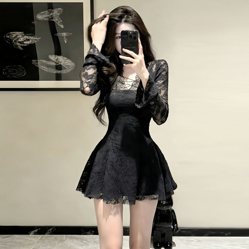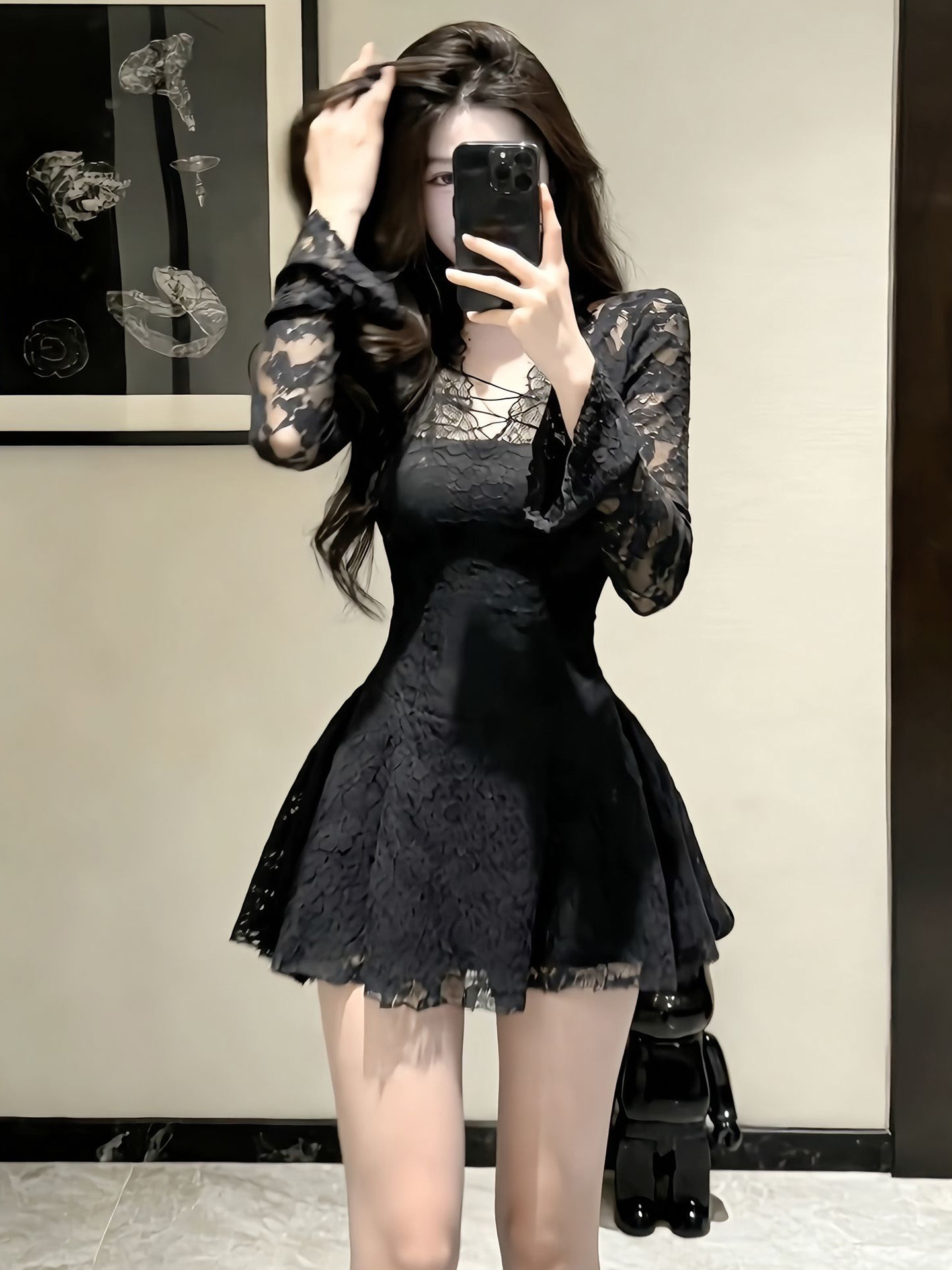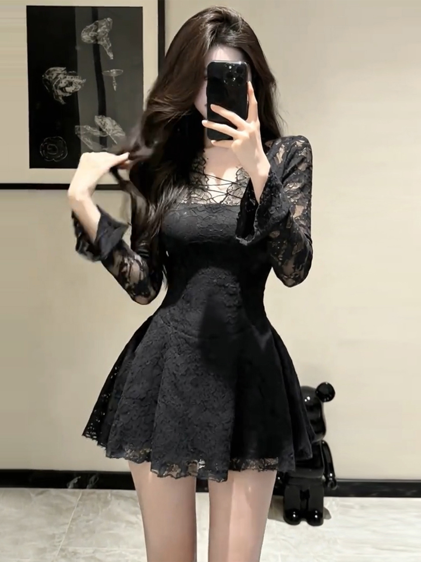 2026 new sexy pure desire black lace dress women's autumn and winter royal sister wears a French pinched waist skirt