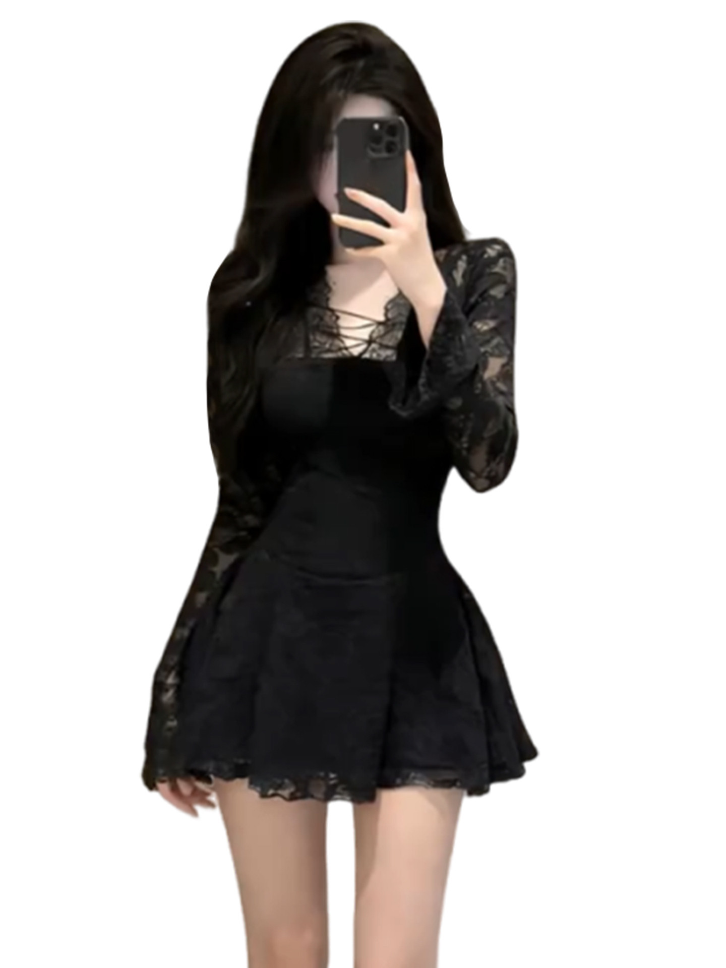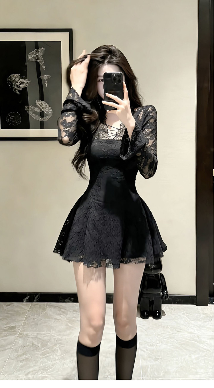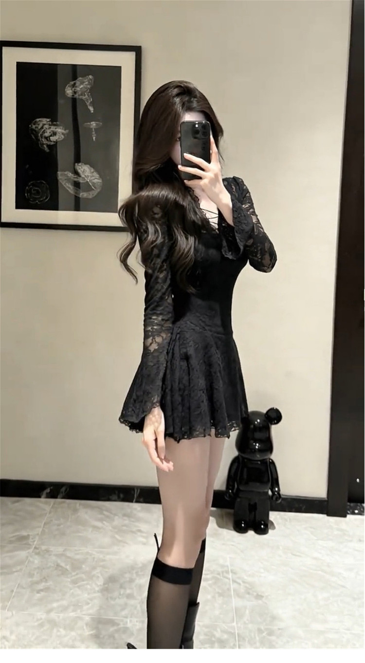 2026 new sexy pure desire black lace dress women's autumn and winter royal sister wears a French pinched waist skirt