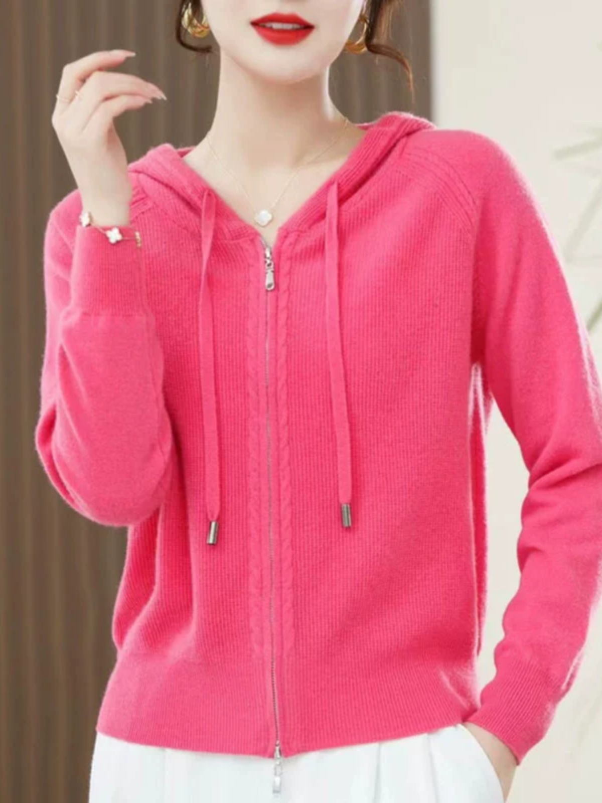 Spring and Autumn Wear New Style Wearing Foreign Style Hooded Cardigan Women's Knitted Jacket with Long Sleeves Loose Solid Color Bottom Sweater Jacket