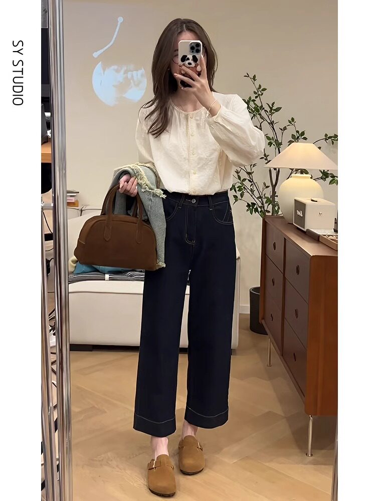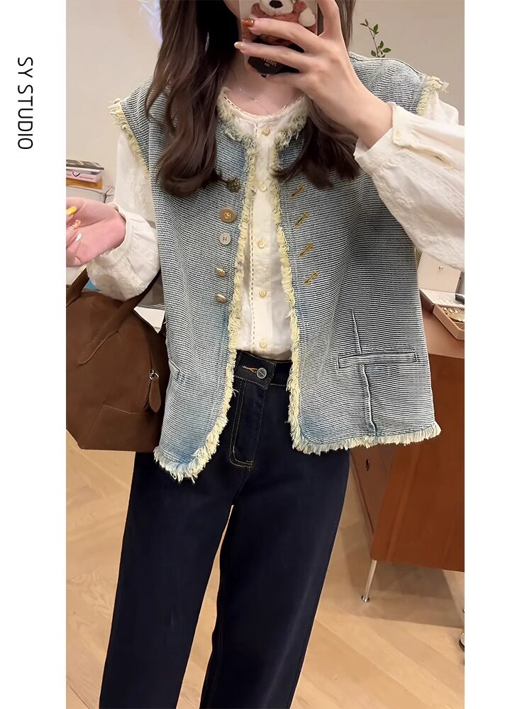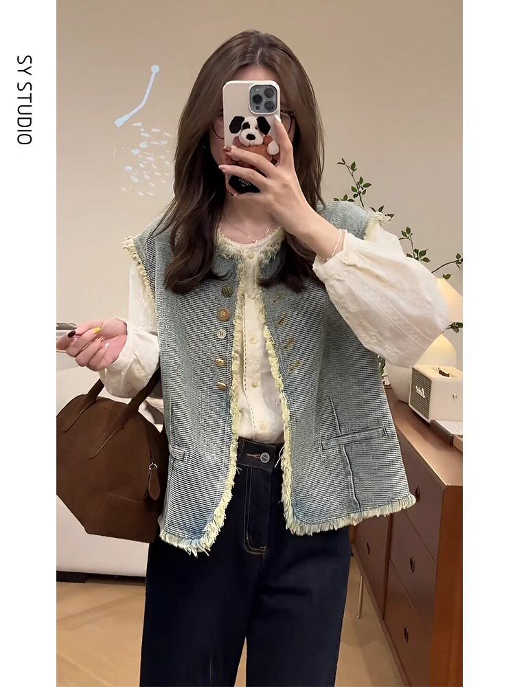 Spring dress retro style outfit: a complete set of women's plus-size MM chic slimming denim vest jacket and shirt three-piece set