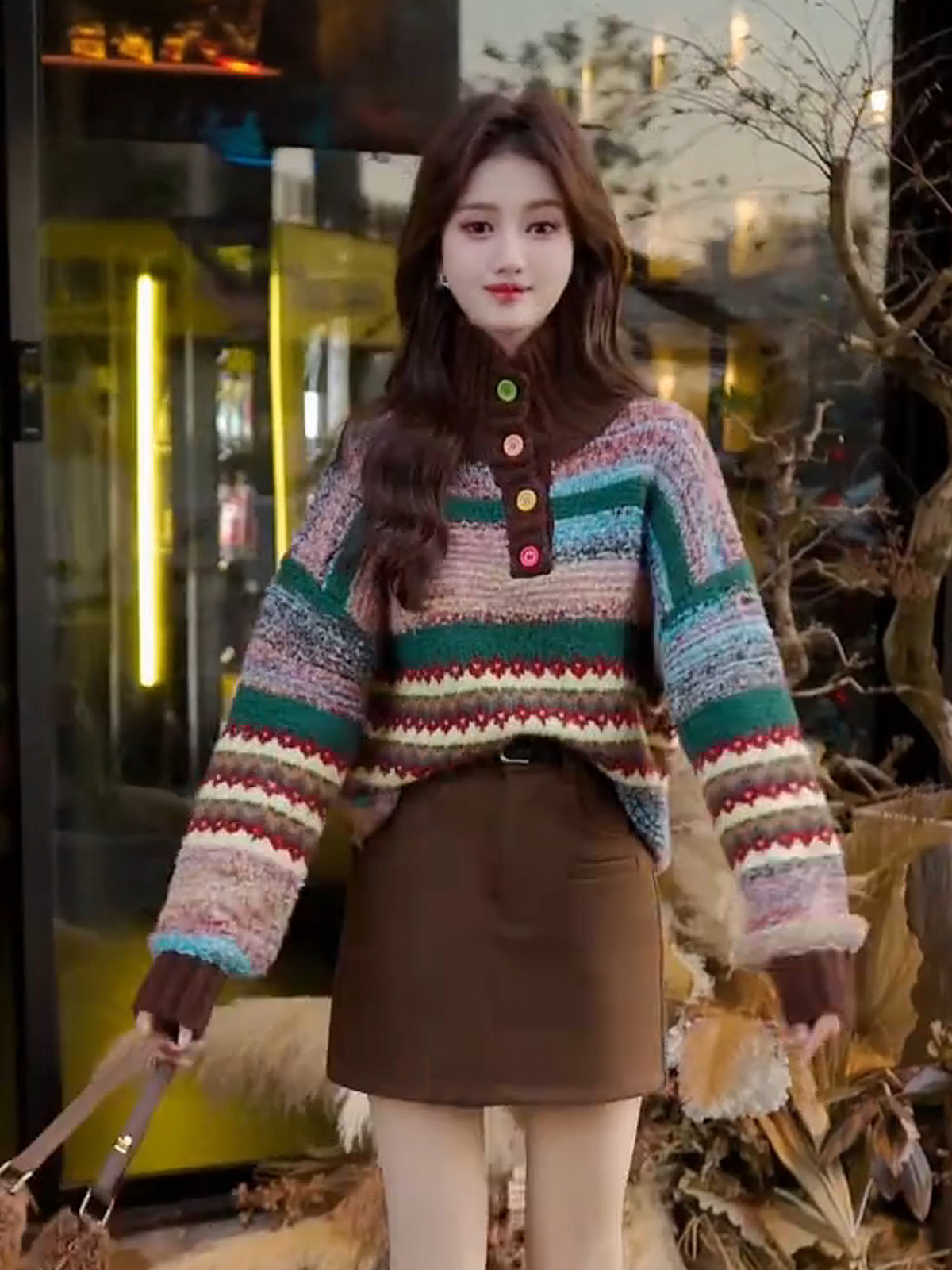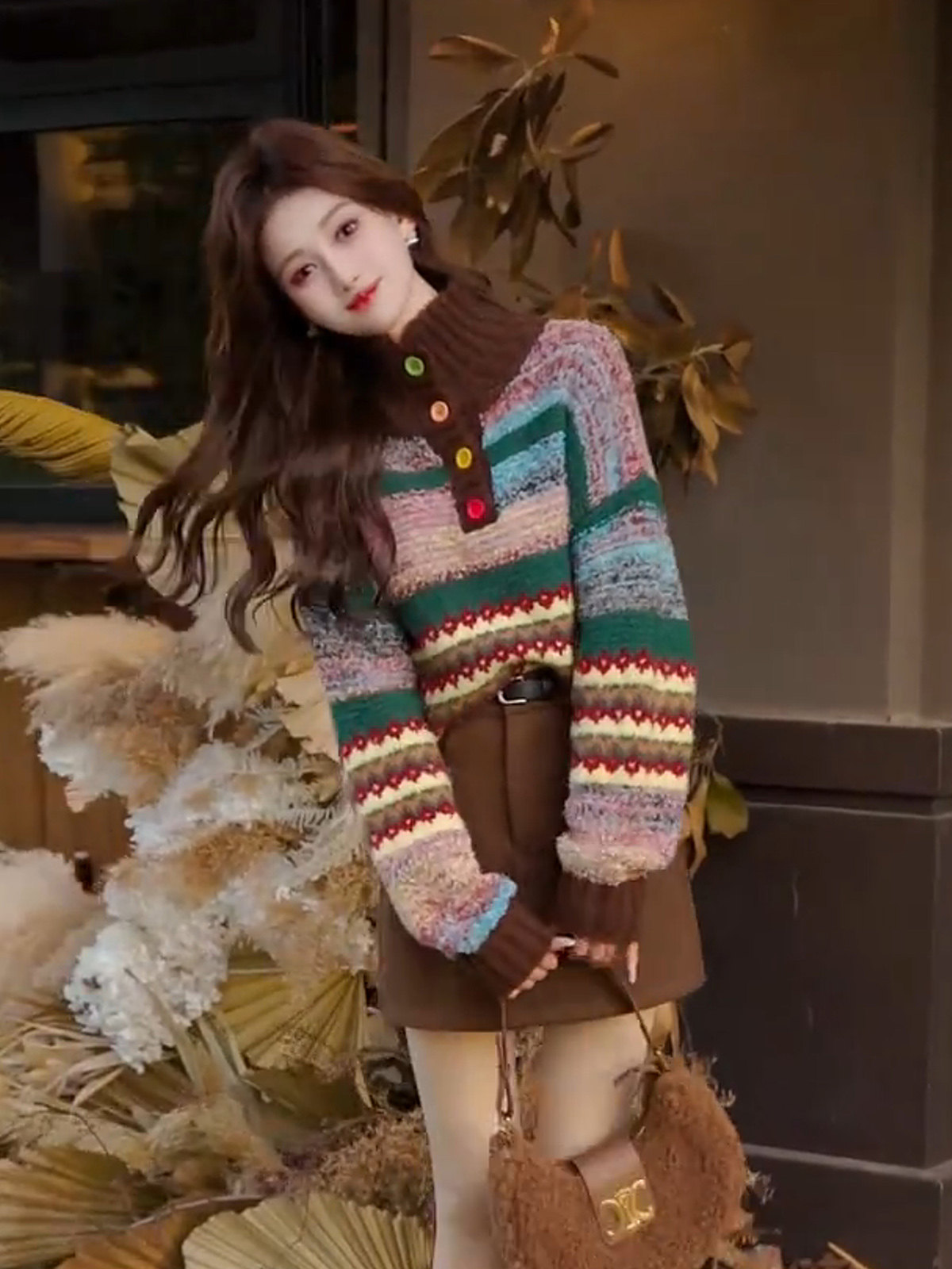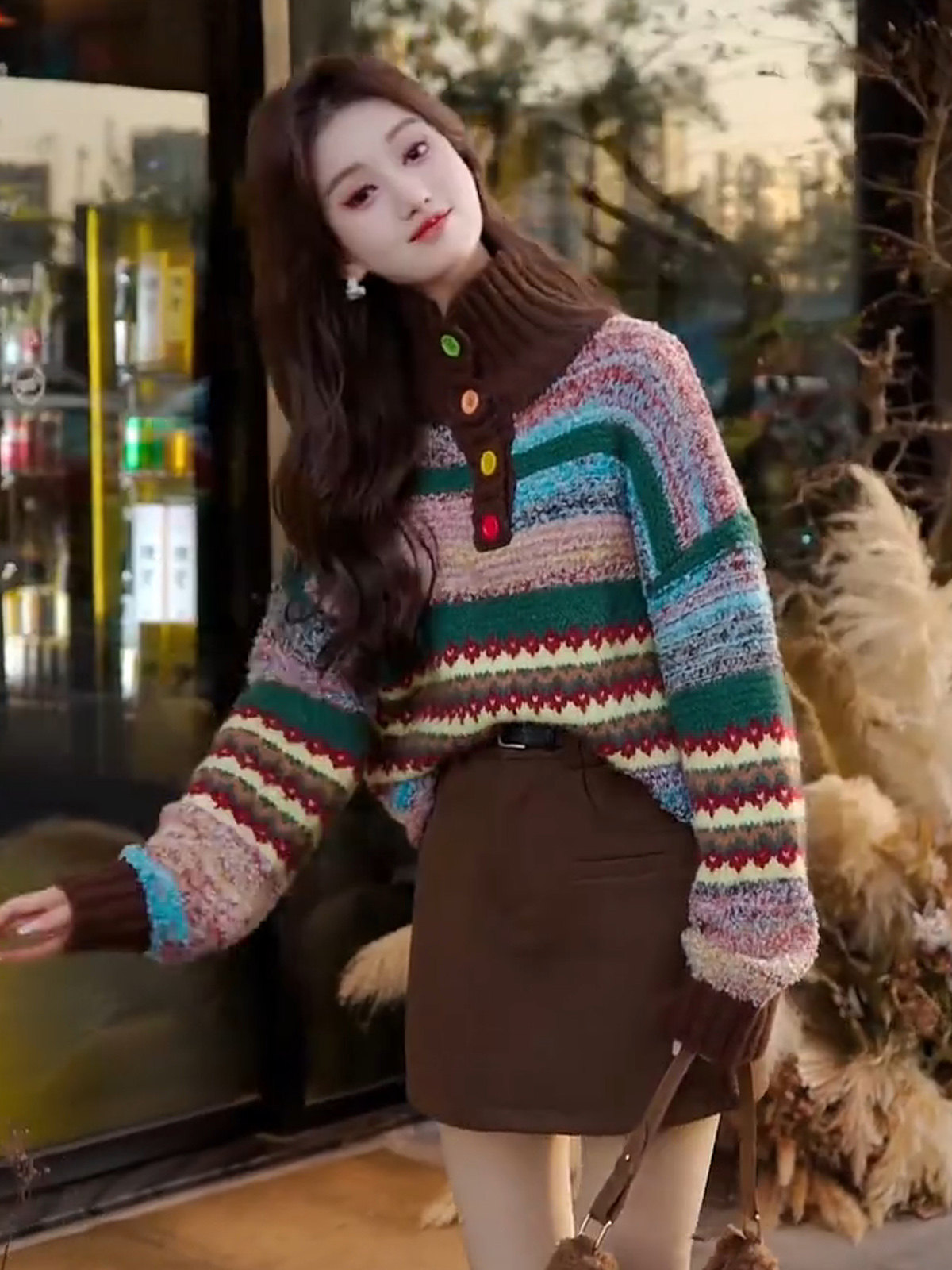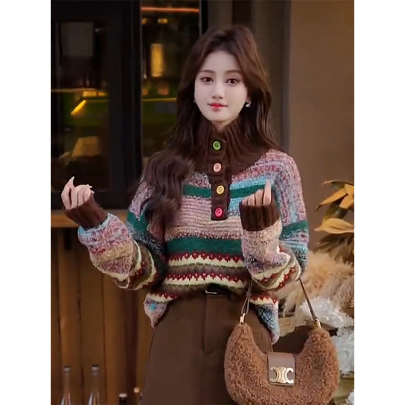 Vintage colorful button-down jacquard turtleneck pullover sweater women's winter fashion loose soft thick knit top