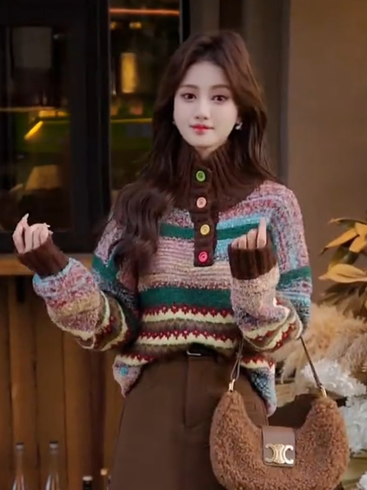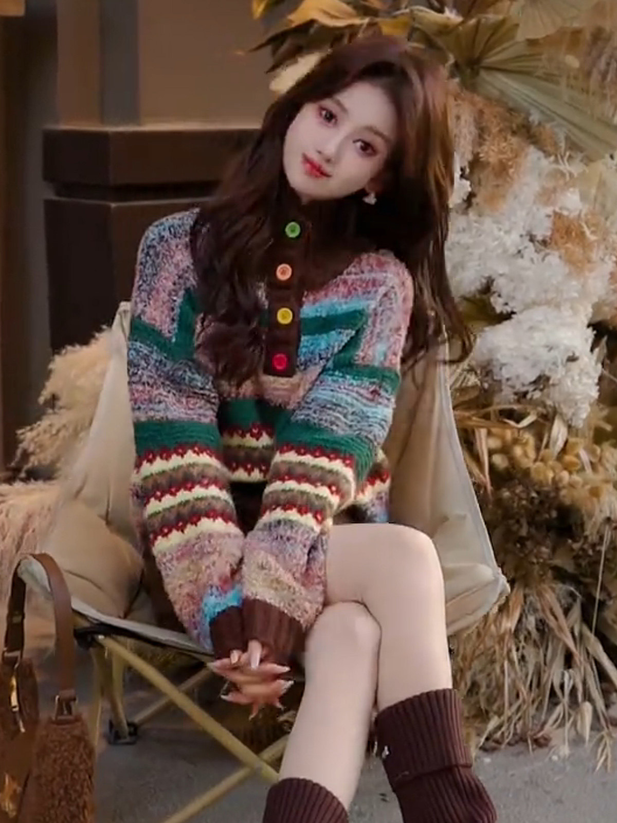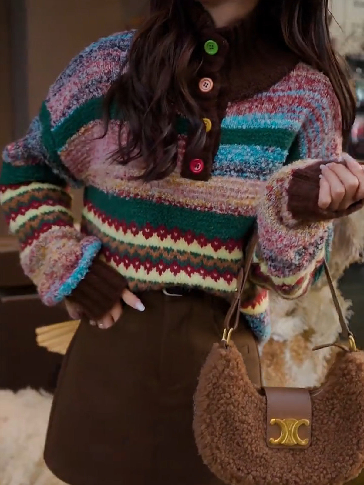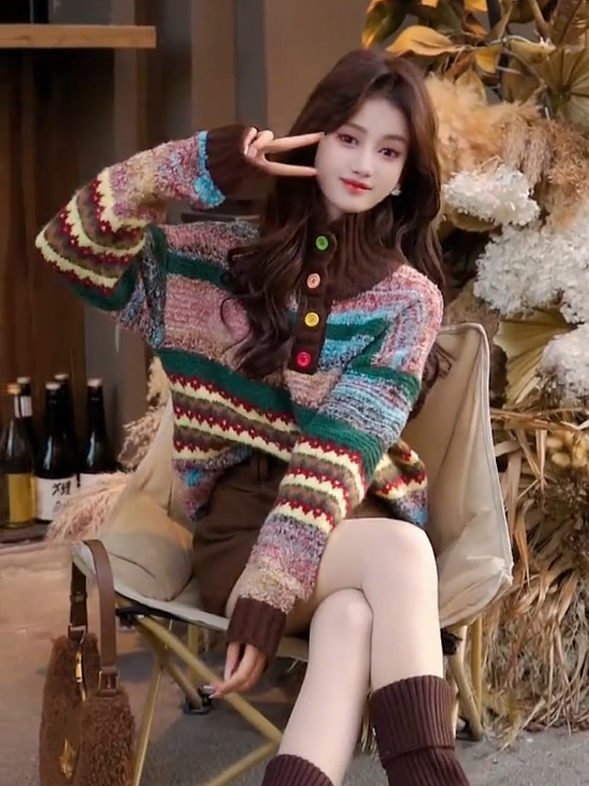 Vintage colorful button-down jacquard turtleneck pullover sweater women's winter fashion loose soft thick knit top