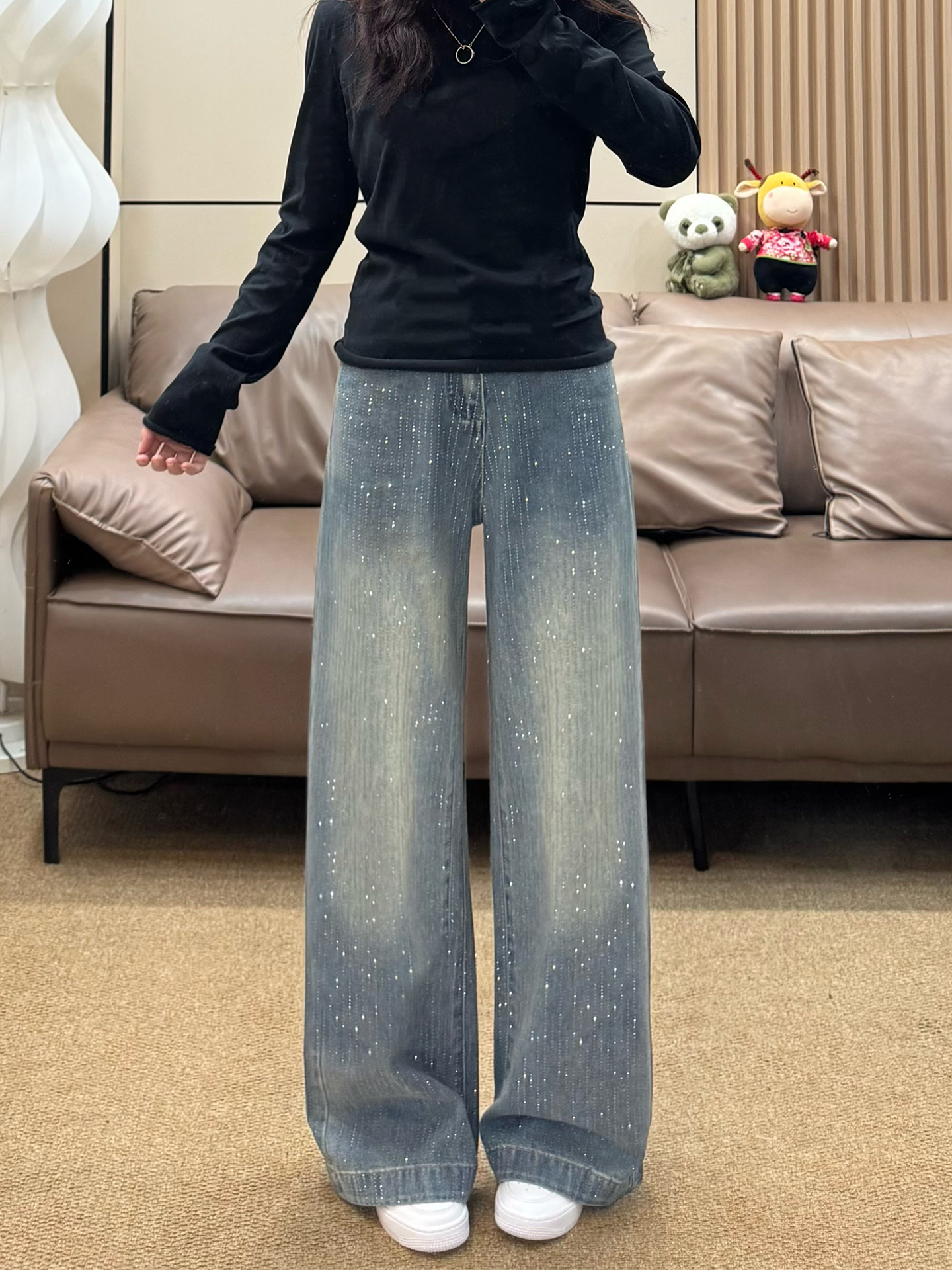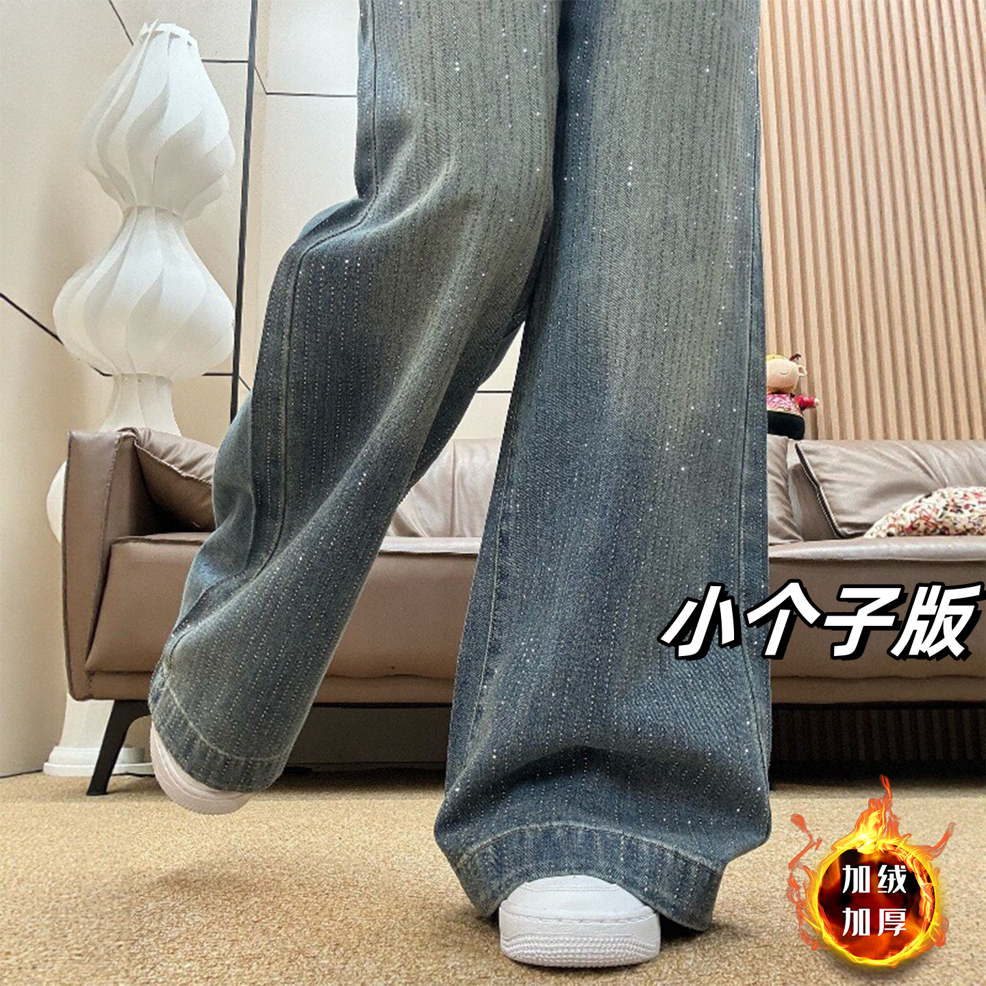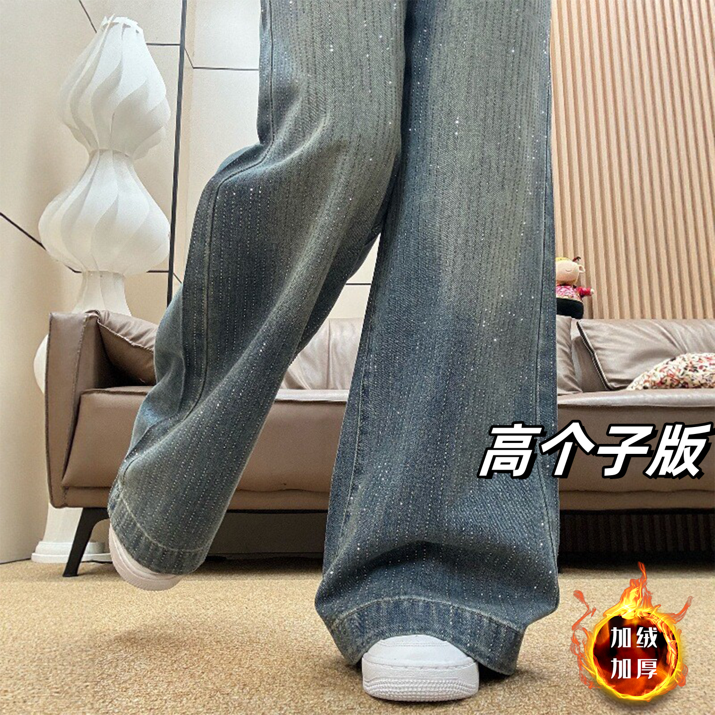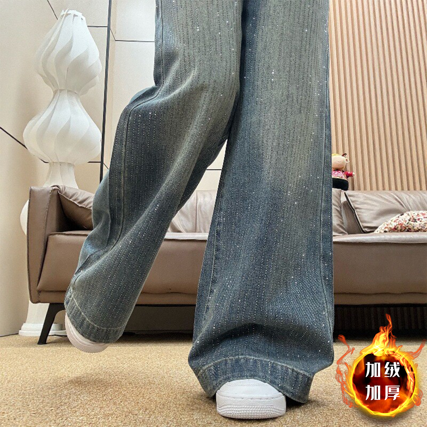Baby's breath hot diamond wide-leg jeans women's autumn and winter fleece plus-size fat mm high-waisted loose slimming straight-leg floor-length pants