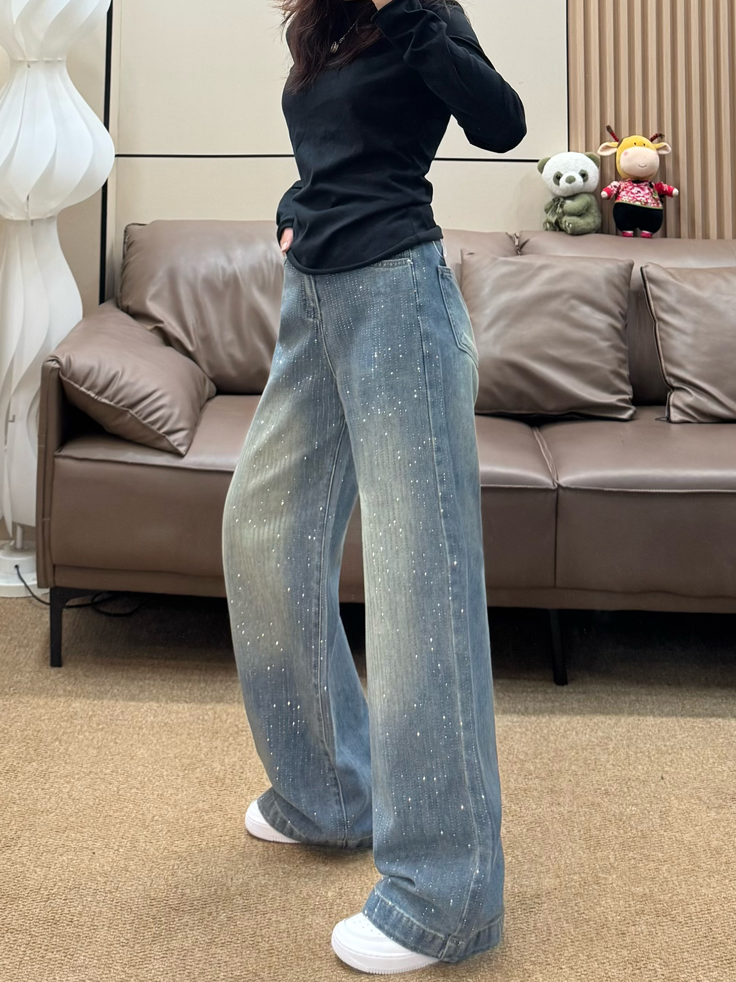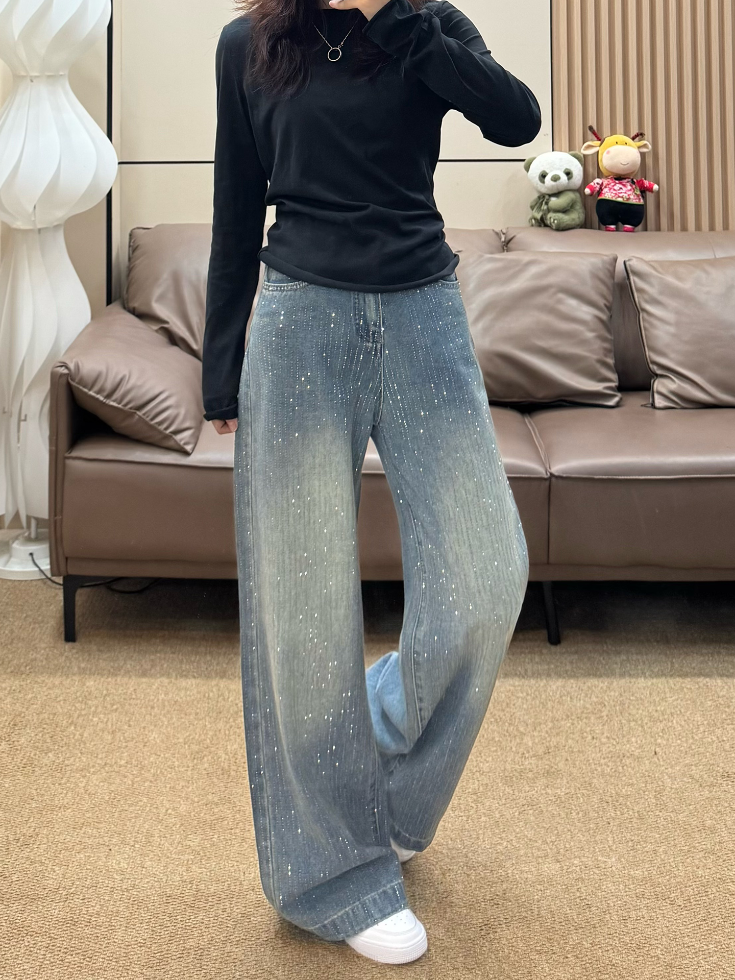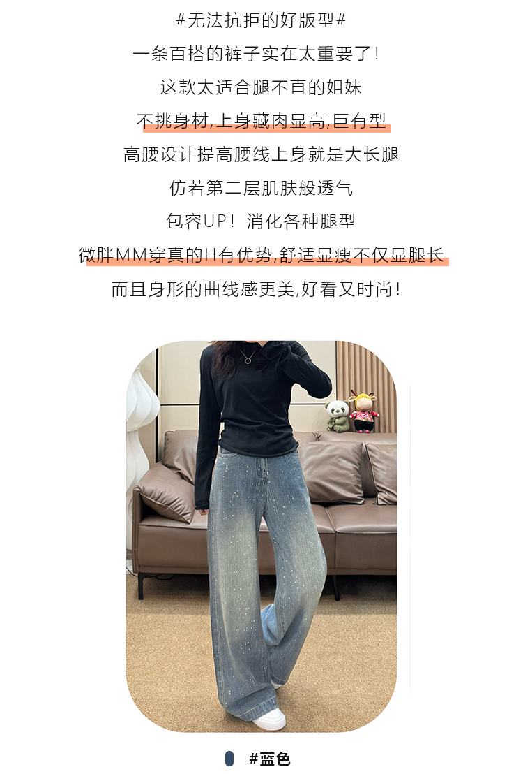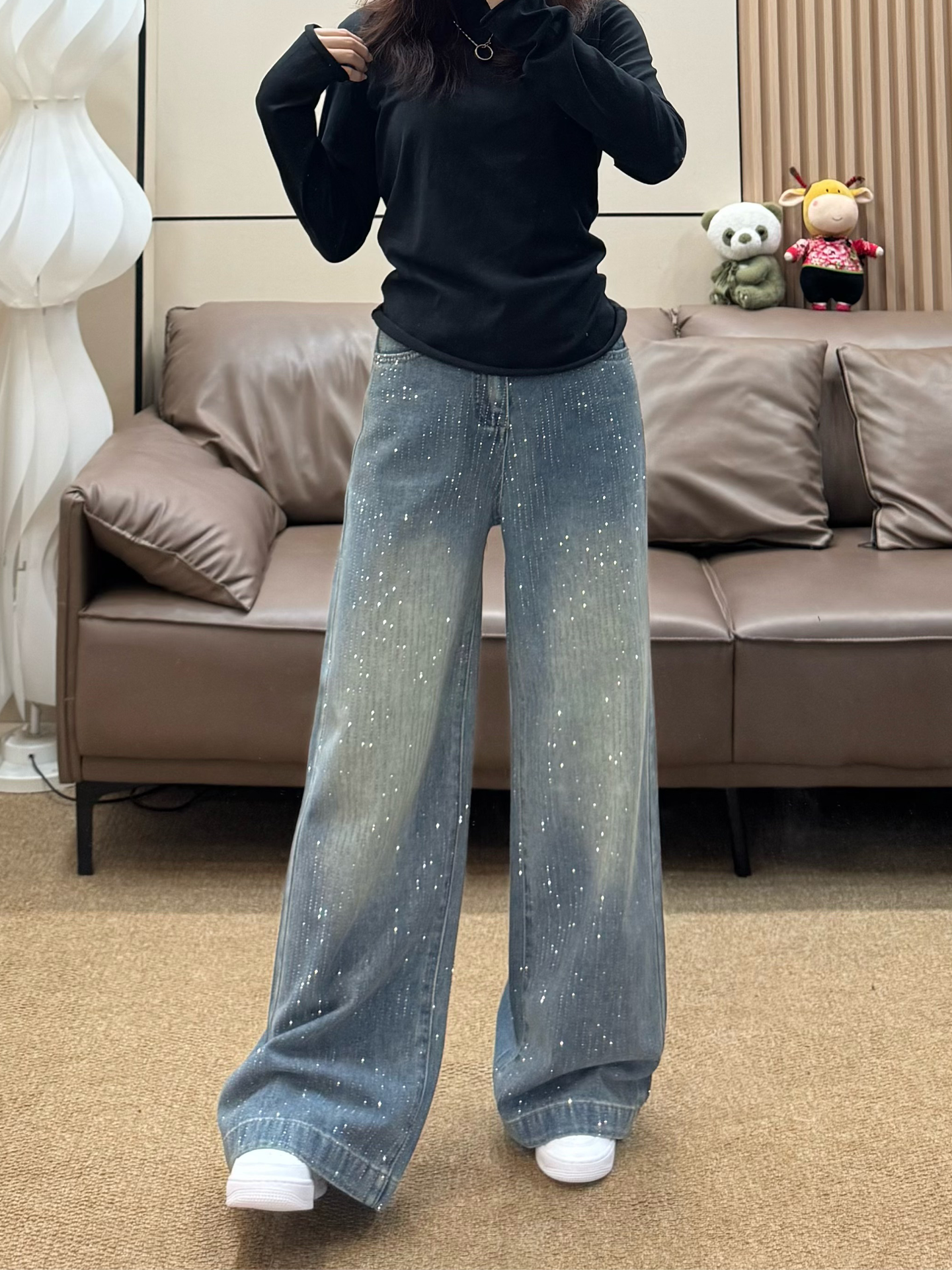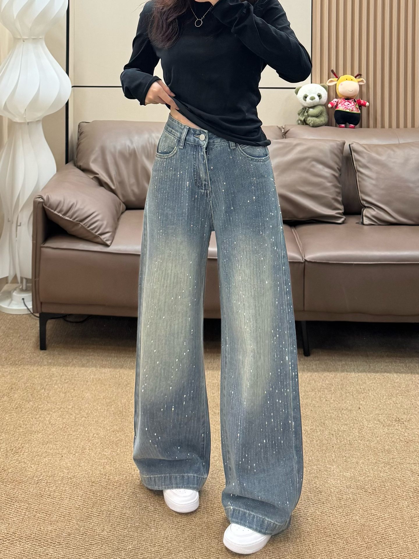 Baby's breath hot diamond wide-leg jeans women's autumn and winter fleece plus-size fat mm high-waisted loose slimming straight-leg floor-length pants
