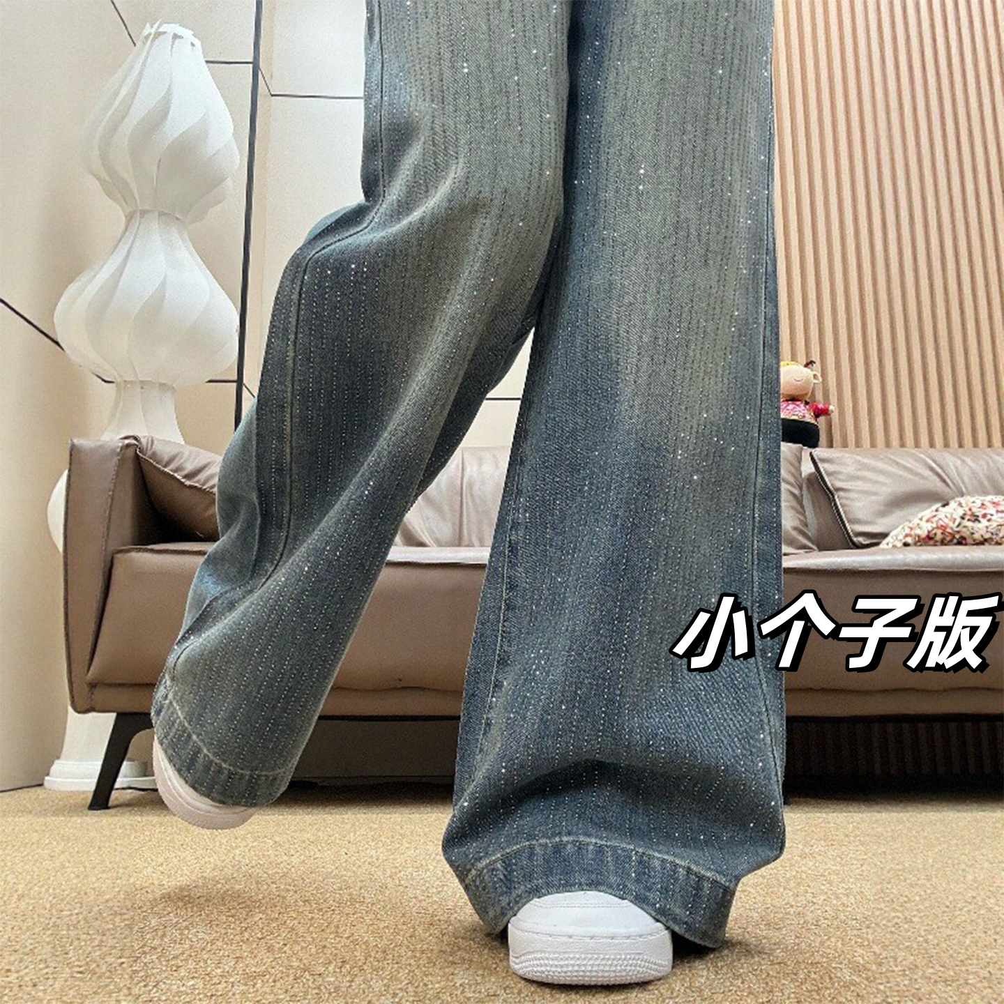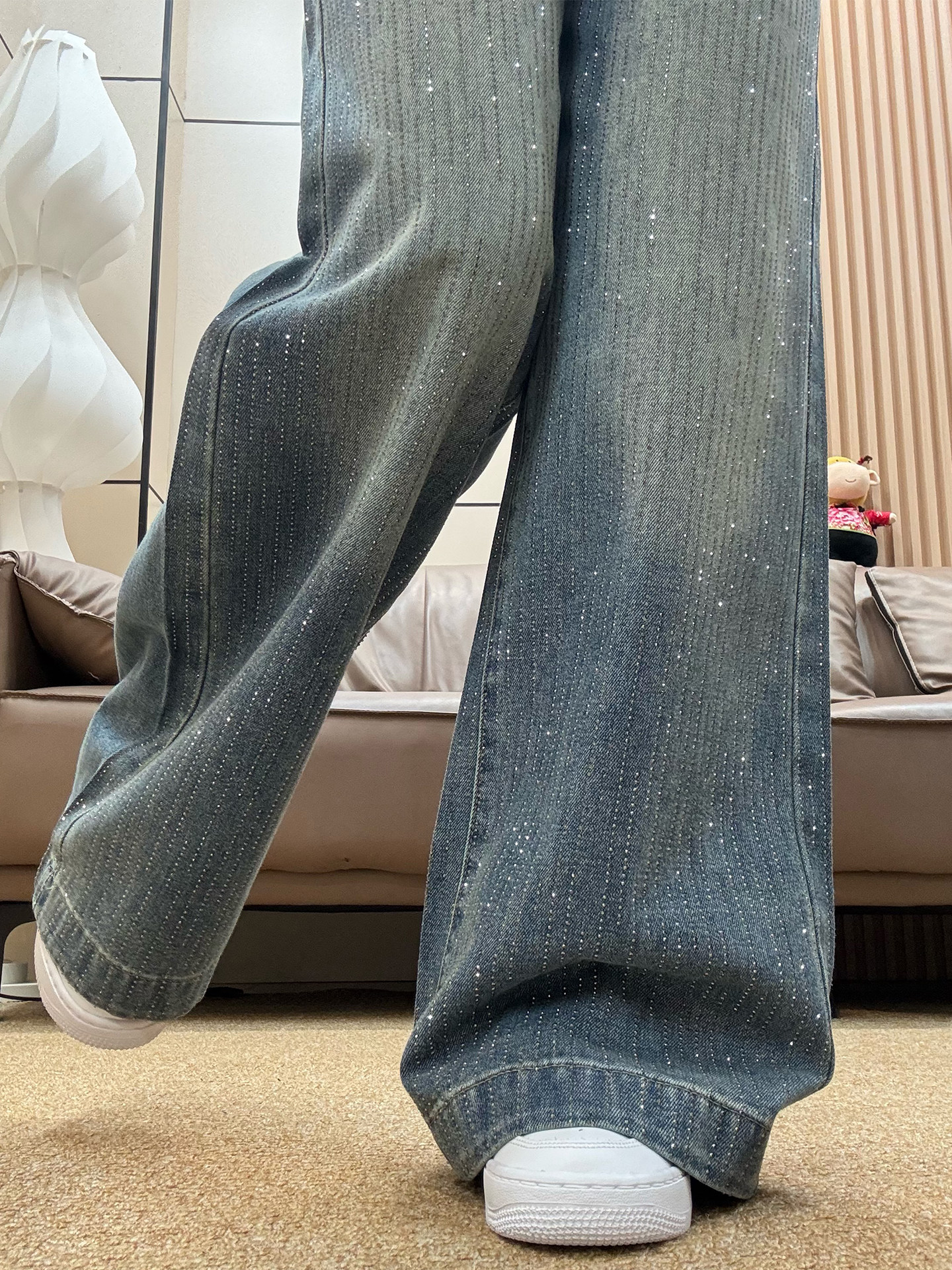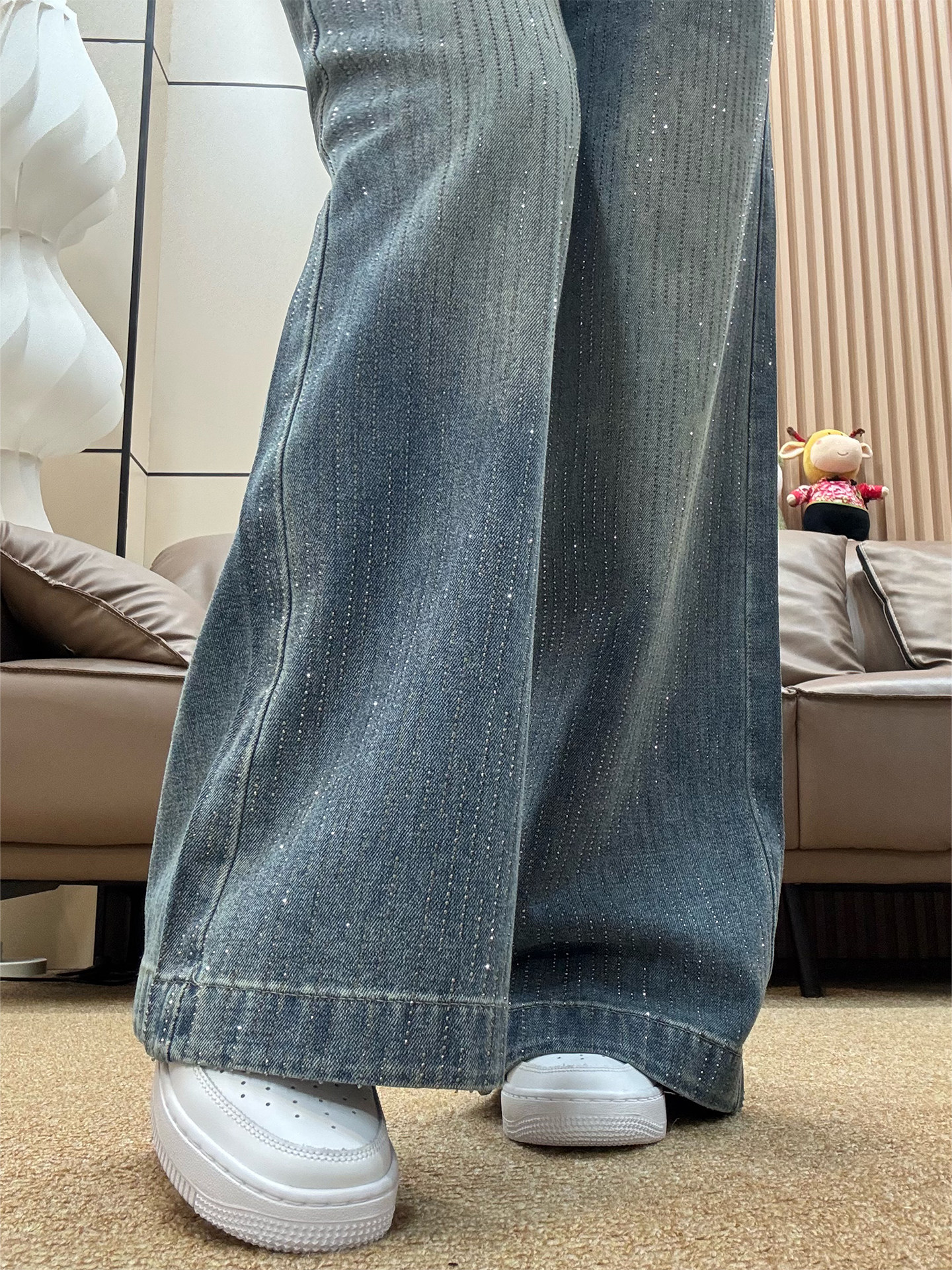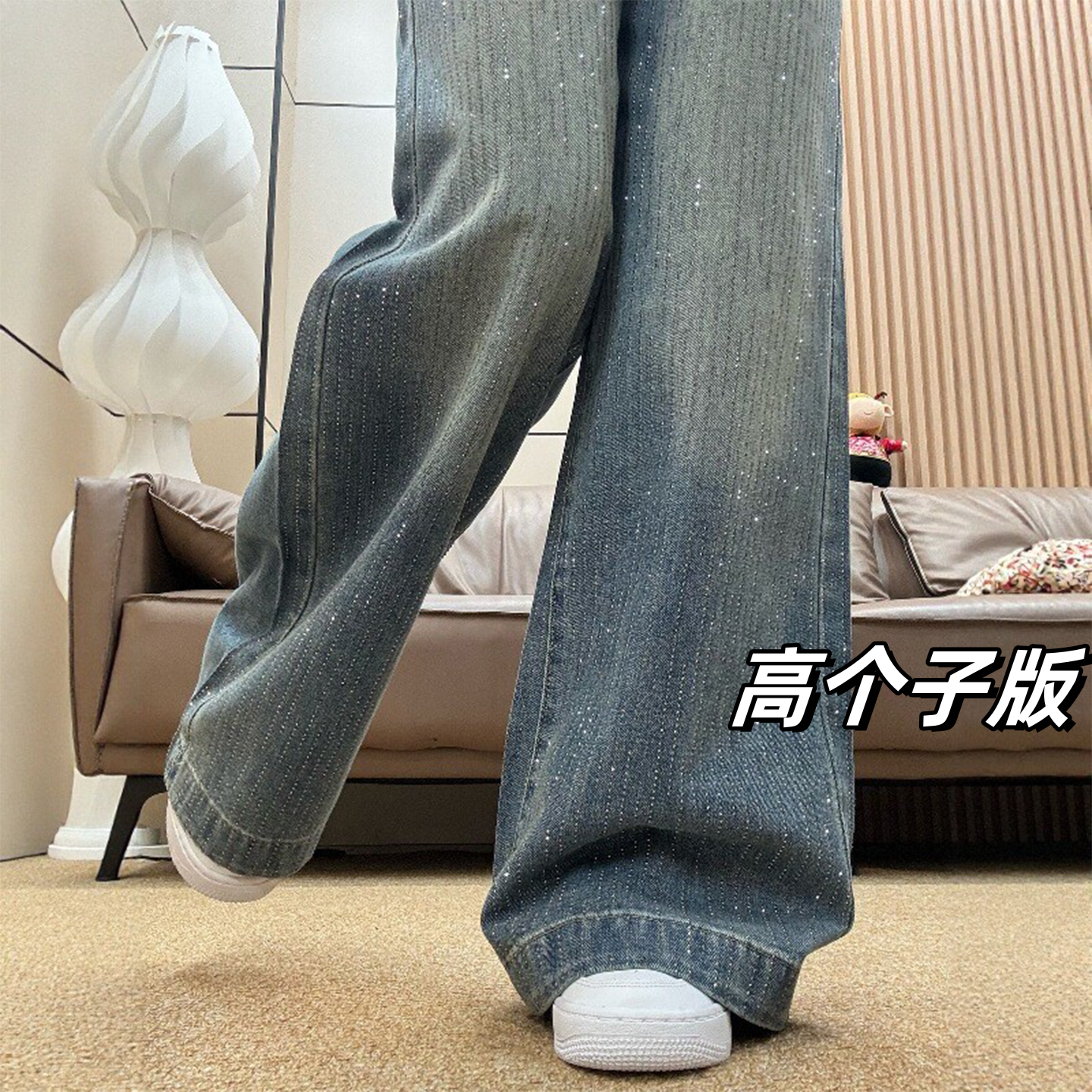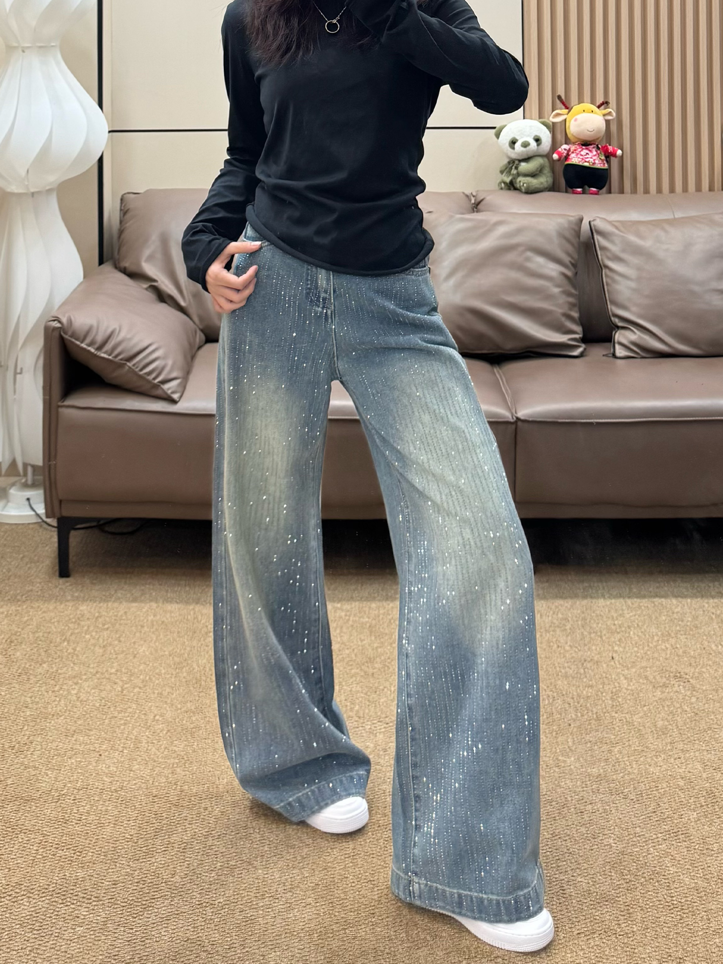 Baby's breath hot diamond wide-leg jeans women's autumn and winter fleece plus-size fat mm high-waisted loose slimming straight-leg floor-length pants